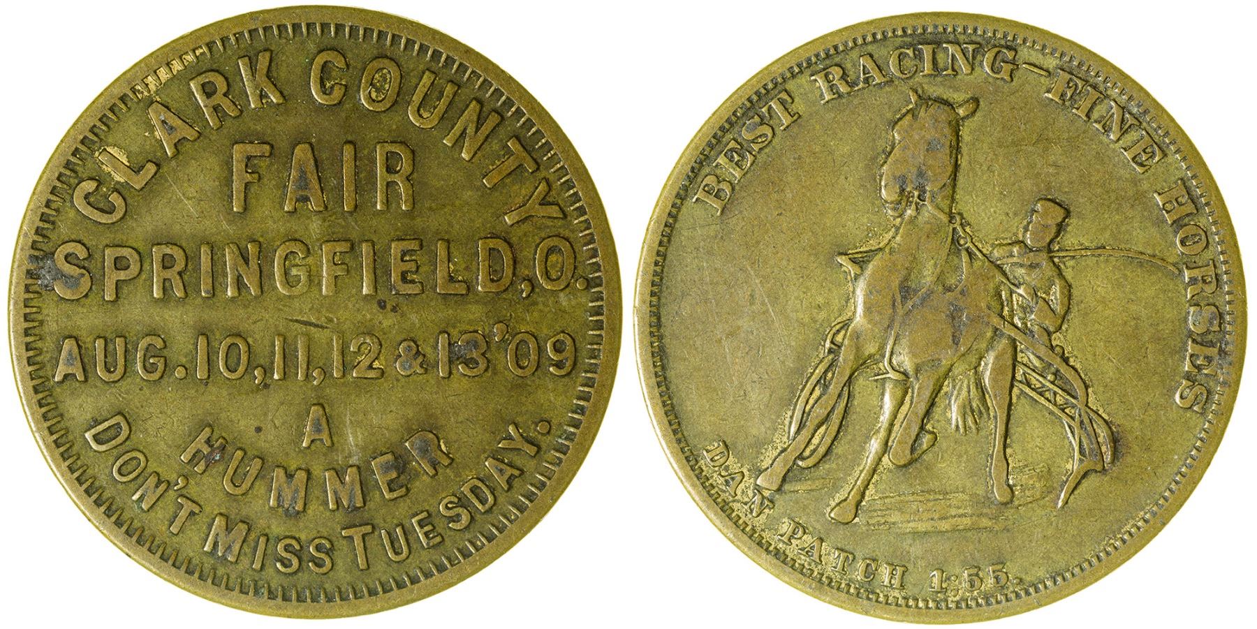 Obv.: Clark County / Fair / Springfield, O. / Aug. 10,11, 12 13 '09 / A / Hummer / Don't Miss Tuesday. Rev.: Best Racing / Fine Horses / Dan Patch / 1:55. Br., rd., 30mm. HWAC# 47948 Date: Location: Springfield, Ohio