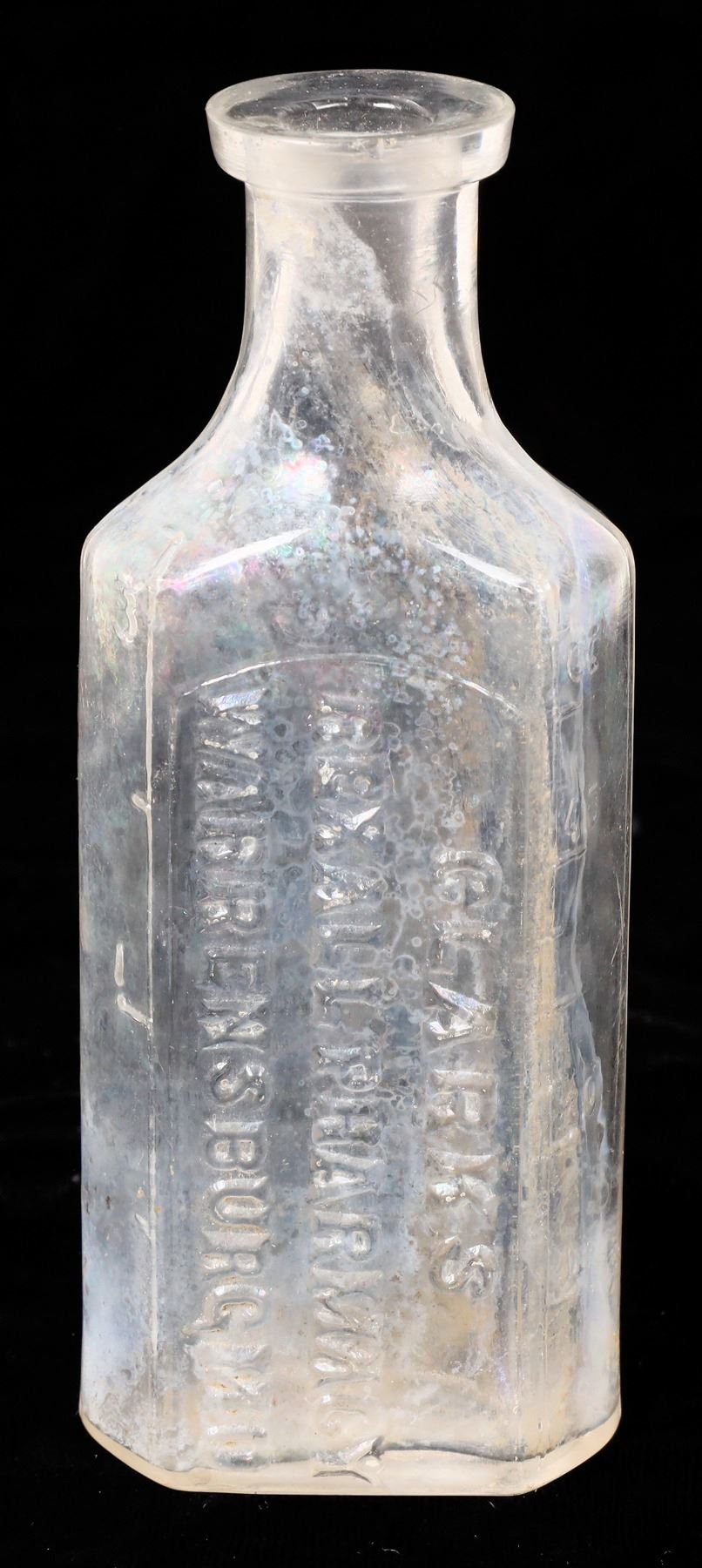 Embossed Clark's Rexall medicine bottle 4.5". No apparent chips or cracks. Missouri Warrensburg Geff Pollock Collection