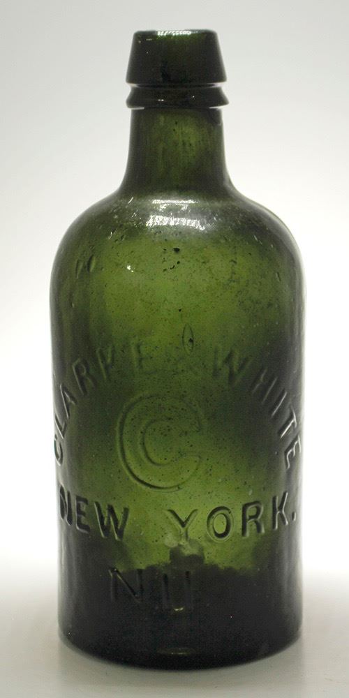 Saratoga mineral water bottle from the Shamberger collection. No visible chips or cracks except as noted. CLARKE & WHITE/ C/ NEW YORK./ N11. "Arriving in Saratoga Springs in 1822, New York City soda-fountain owner John Clarke saw the commercial potential of the area's pure waters. He purchased land and established a venture bottling mineral water. With partner Thomas Lynch, Clarke successfully marketed his bottled water across the country and Europe. Not long after, he married the widow Eliza White who had purchased the High Rock Spring. Together the couple formed a successful company, Clarke & White, to bottle their Saratoga mineral waters. After Clarke's death in 1846, their children managed the family business for some years." From http://odysseysvirtualmuseum.com. Molding defect in lip similar to a smooth chip. HWAC# 50152 Date: Location: Saratoga, New York