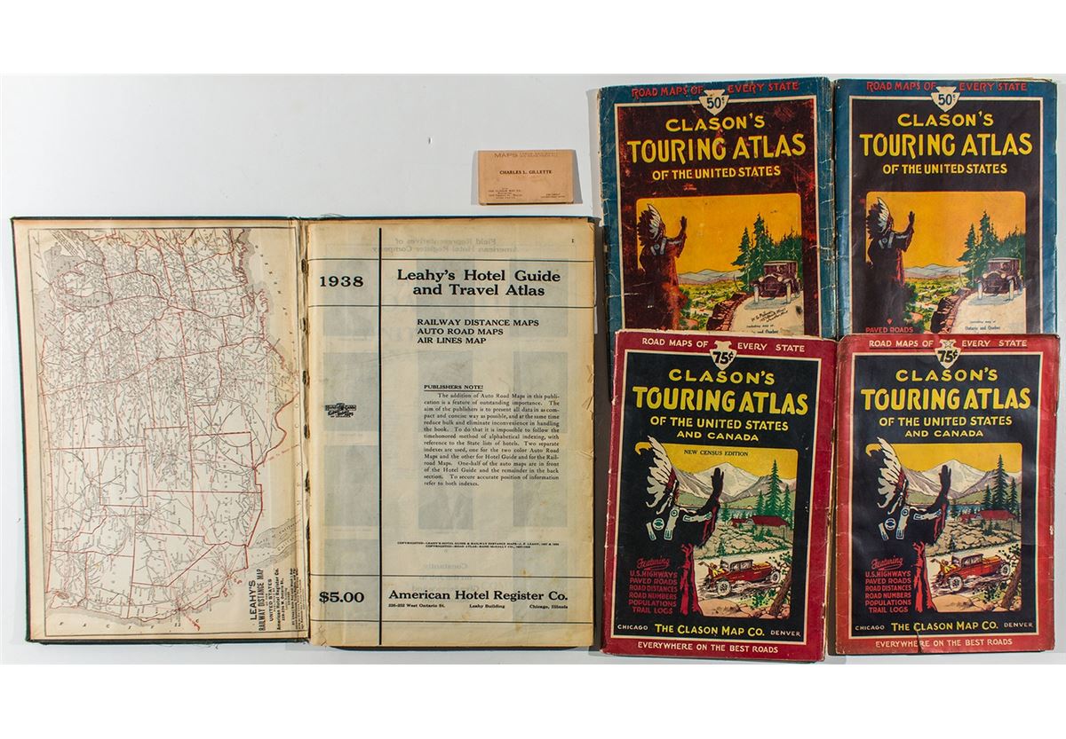 Clason's Touring Atlas (12" x 8.25", opens to 12" x 16.5"), 4 copies. An accurate guide to the best roads in every state. Published by the Clason Map Company, Denver Colorado. Two copies priced at 50 cents and other two priced at 75 cents.One copy dated 1931. In 1923, the Clason Map Company produced its first road atlas of the United States. An advertisement appearing in the August 4, 1923 issue of the Chicago Daily Tribune (shown at right) shows a picture of Clason's "Best Roads of the United States" atlas and proclaims that it is "just off the press; nothing like it has ever been published before." There is some validity to this claim. Although the Cram Co. had produced a "Good Roads Atlas of the United States" and an "Auto Trails and Commercial Survey of the United States" a few years earlier, the road component of theses atlases was rudimentary at best, consisting of nothing more than a few "main roads" that had been crudely overprinted in red on some already existing state railroad maps. By contrast, Clason's road atlas contained fresh state maps that focused just on the road networks and that provided such details as the mileage between towns as well as the quality of the roads. Rand McNally followed this approach as well when it launched its first U.S. road atlas one year later. Copies are in used condition. All are in used condition. Hard bound, dark green cover of Leahy's Railway Distance Maps, Auto Road Maps, Air Lines Map (16" x 10.25") 106 pp. Published by American Hotel Register Co., Chicago. Copyright 1937 by Rand McNally & Company, Chicago, San Francisco, New York. Inside is loose from the binding. Also included is a tiny pamphet with a fold-out "Sketch" map of Colorado (3.5" x 2"), opens to 8.5" 11". Very good condition.