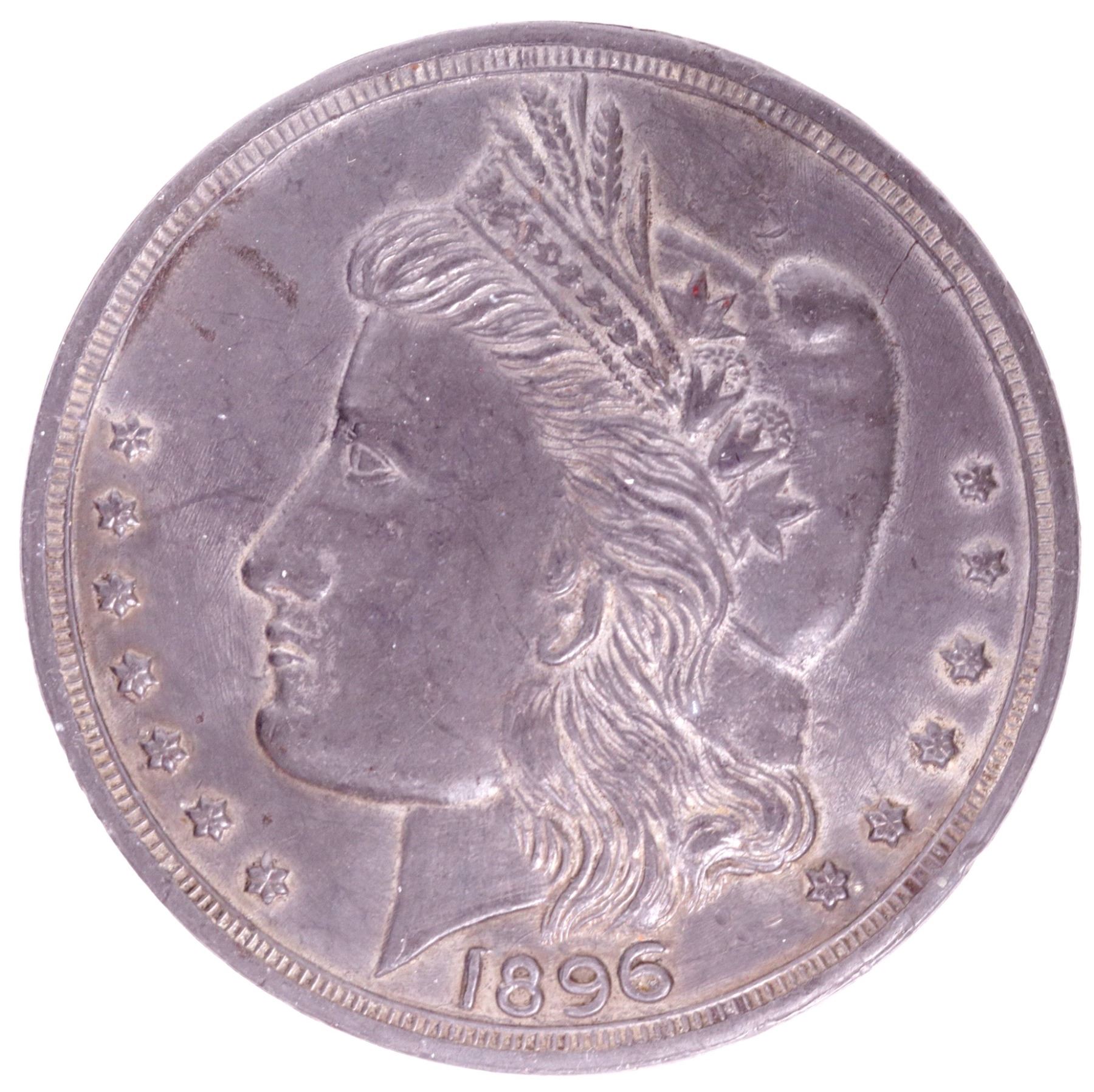 Class II Bryan Dollar, Schornstein 814 (Zerbe unlisted): Bryan money dollar with wreath in place of Liberty on Coronet. A clean example of the type with only 1 ding on the reverse next to the D in UNITED. Schornstein notes the type as being Very Rare. Type Metal (lead alloy), 87mm, AU.