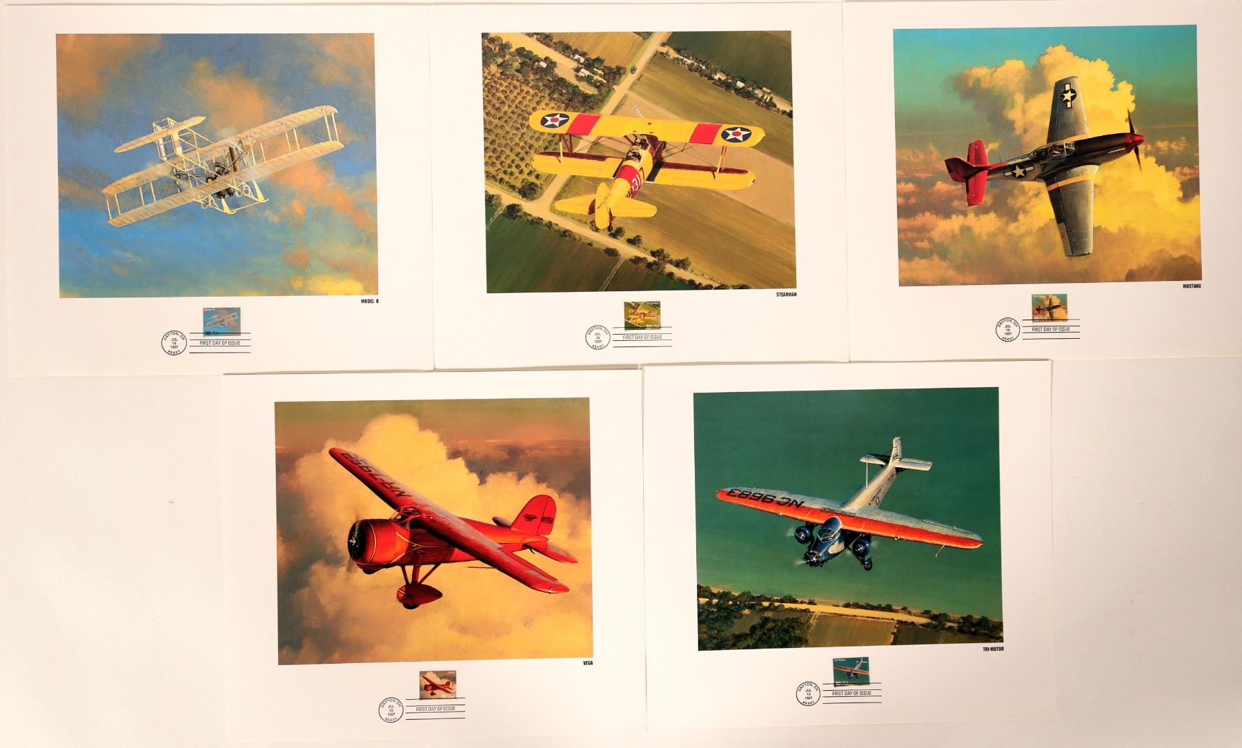 Five prints ready for framing of aircraft honored by U.S. Postal service for the stamp series. Maintained in the original portfolio holder w/pictures and descriptions of each aircraft which includes Model B, Stearman, Mustang, Vega, and the Tri-Motor. 16 X 14 each print has the stamp and the date of first issue. In excellent condition.
