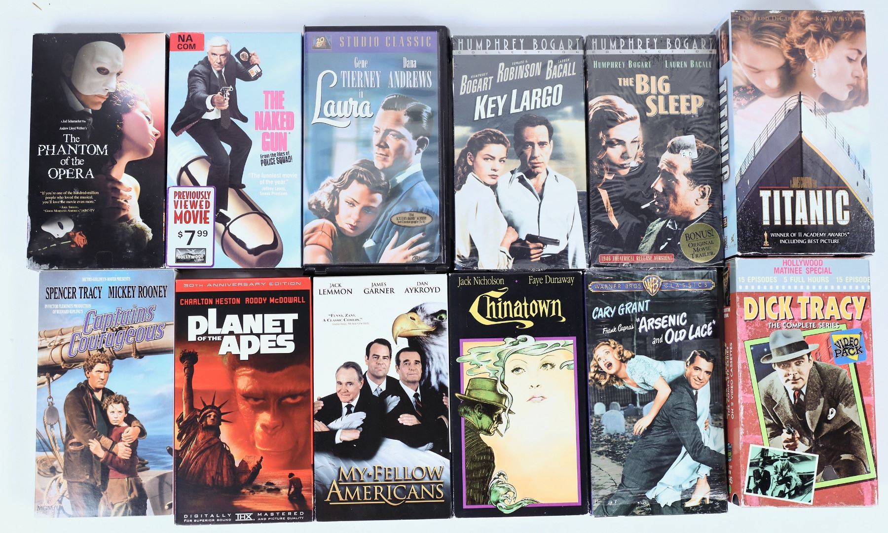 12 classic movies on VHS. Planet of the Apes, Titanic, Naked Gun, Dick Tracey, Arsenic and Old Lace and more.
