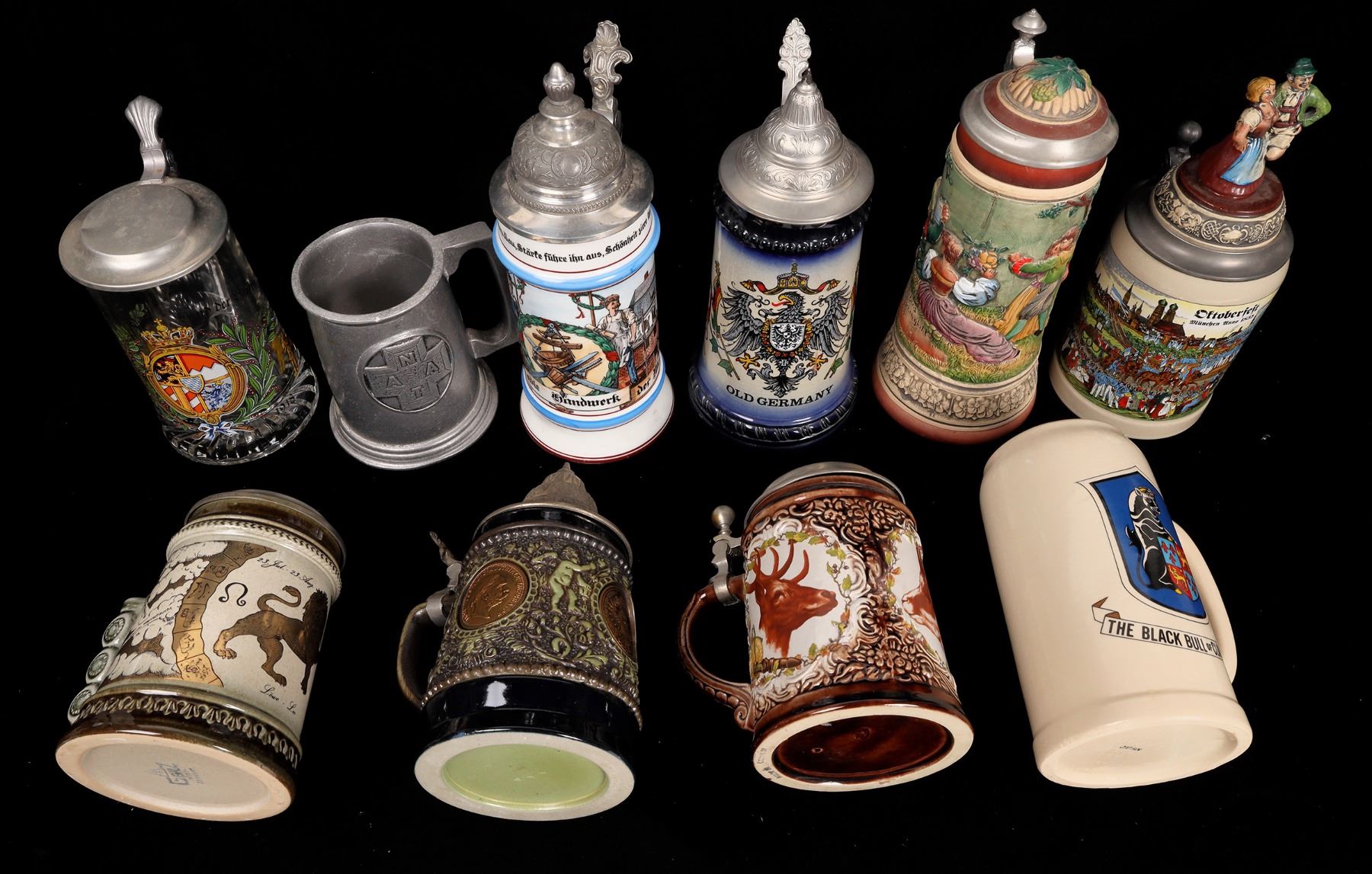 10 beer steins. German classic-Green with coin, 7.25". Light cobalt, 8.75"Oftoberfest, 9". Party, 9". Pewter-N A A T, 1974. Modern-Clear with crest, 7.5". Cobalt Old Germany, 9.25". Black Bull of Clarence, 6.5". Gold Lion, 6.25". Brown animal, 6". No apparent chips or cracks.
