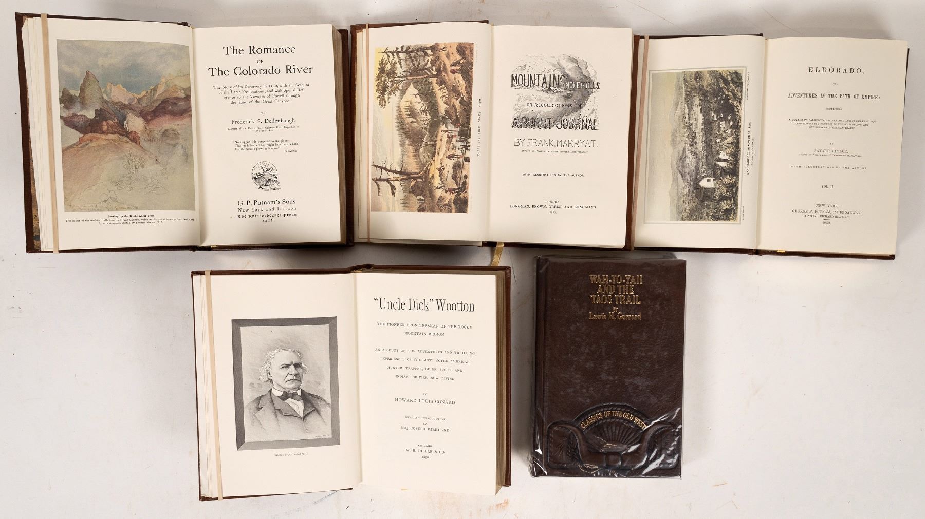 5 high quality c. 1983-83 leather bound reprints, Classics of the Old West by Time Life Books. Mountains and Molehills by Marrat. Eldorado by Taylor. The Romance of the Colorado River by Dellenbaugh. Wah-To-Yah and the Taos Trail by Garrard. "Uncle Dick" Wooton by Conrad. Nice color plates etc.