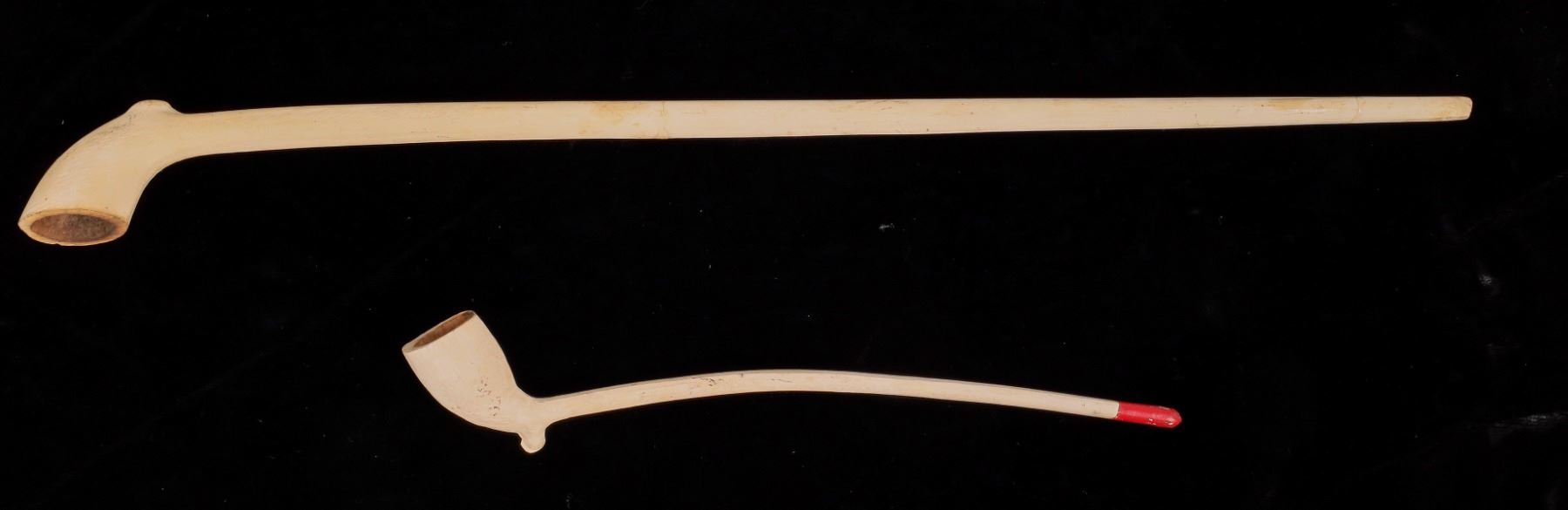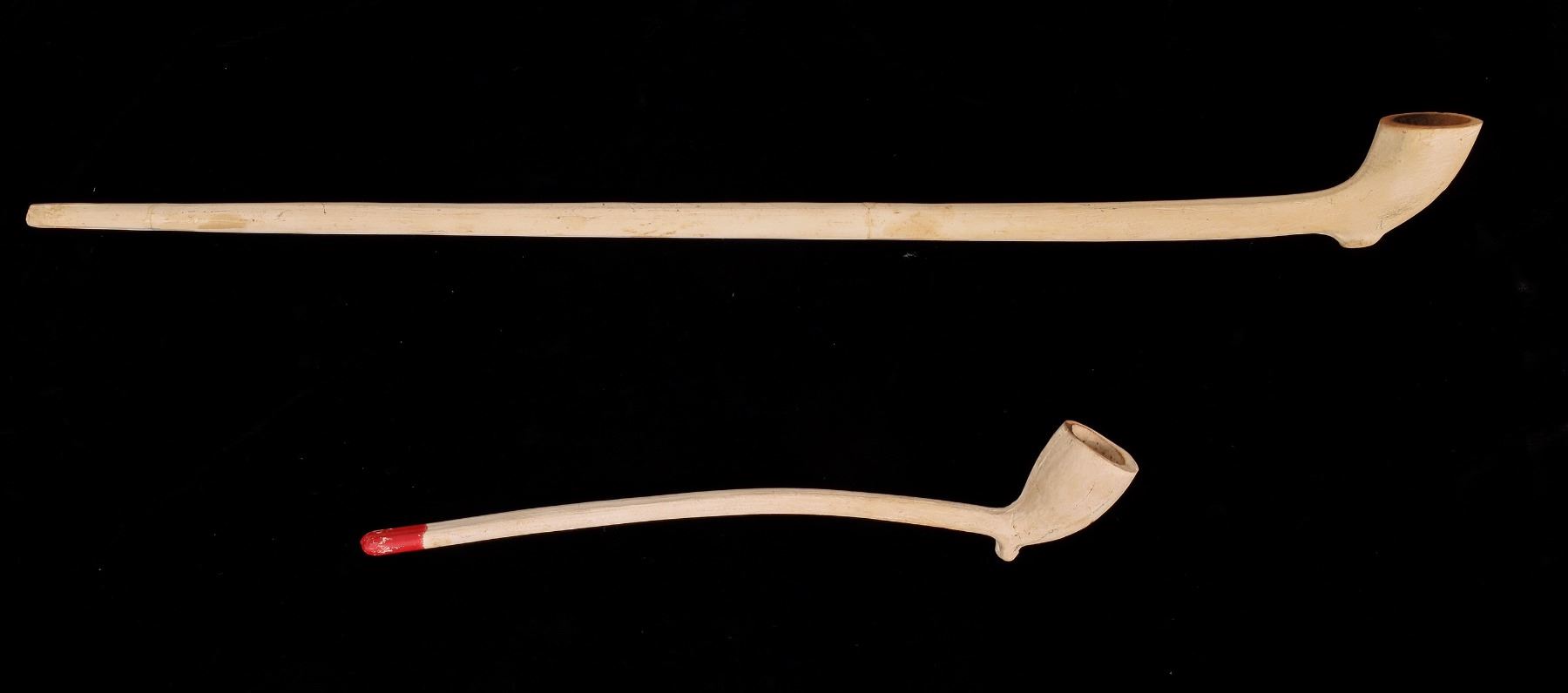 2 clay reproduction Colonial pipes originally purchased in Williamsburg, VA. 8" and 16".