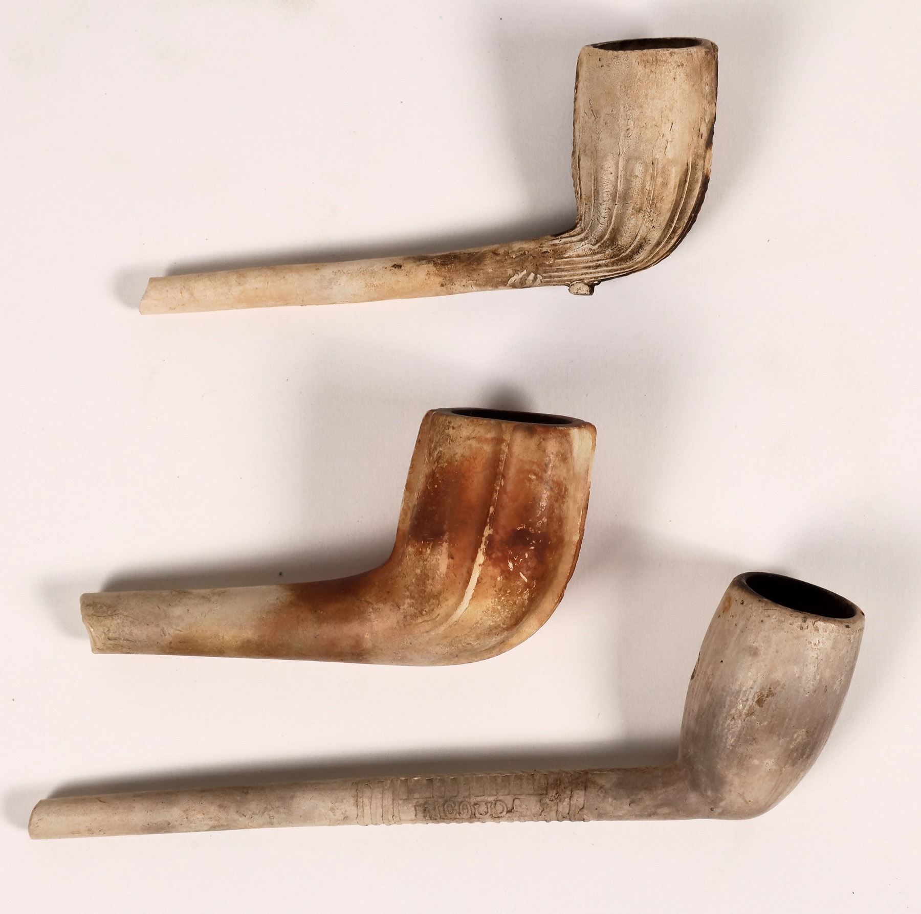 Lot of 3. All found on the ocean floor. 1) Clay pipe with bowl. Ribbed design on bowl base and start of stem. Stem is broken at end. Bowl 1.5x7/8", overall length 4.25". 2) Clay pipe with ribbed bowl and broken stem. Bowl 1.75x1". Overall length 3.5". 3) Clay pipe that is 5.5 in. in length and in very good shape with rosin in the bowl. The stem is about 4 in. in length. When used in a colonial pub the next user would snap off a section to start a fresh and sanitary smoke.