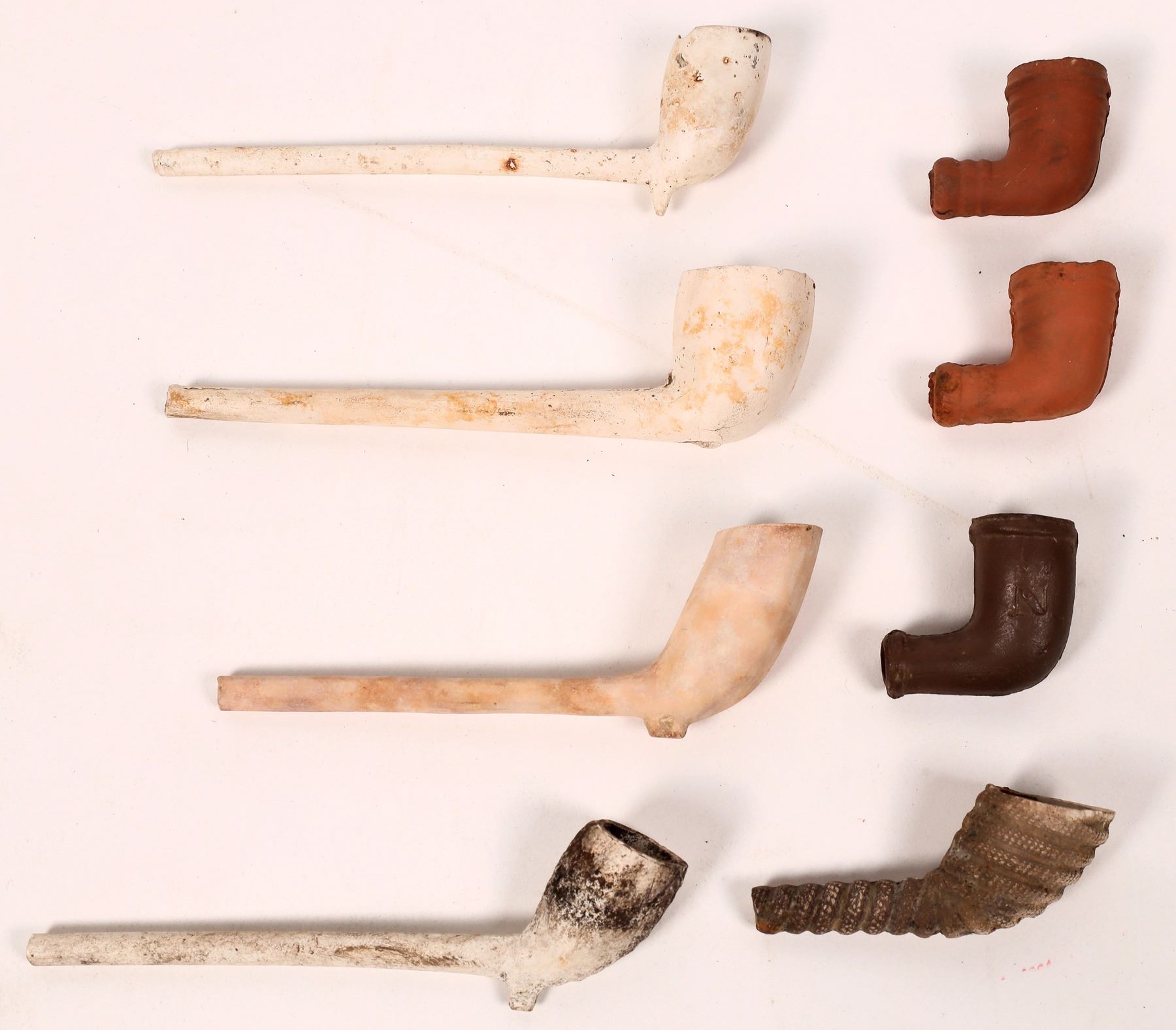 8 vintage clay pipes and bowls. Bowl with letters, ND and could be c. Civil War or earlier. Pipe with FB trademark and 6 point star. 2 white clay pipes from different manufacturers. 1 white clay pipe and 3 bowls with embossed patterns.