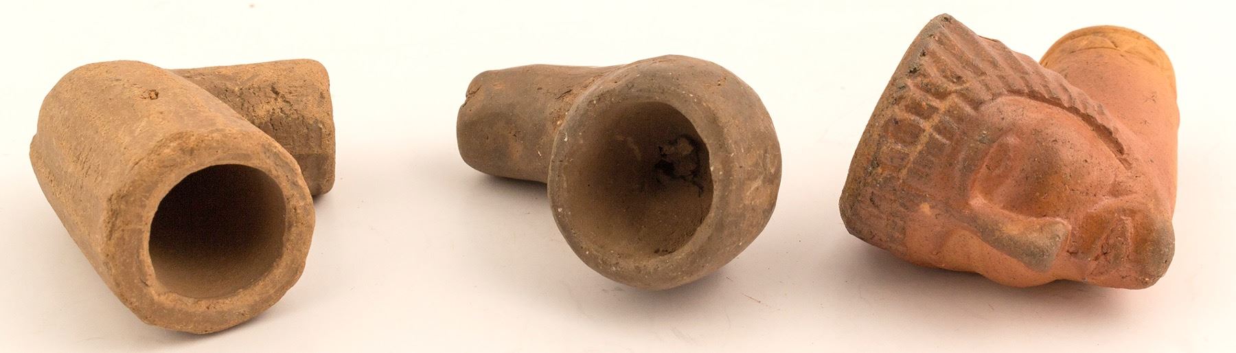 Bradley collection, three early clay pipes found along the Chattahoochee River near Roswell Georgia by Mrs. Bradley, circa 1940s to 1950s. Possibly from the American Civil War.. Please inspect, One is a pictorial face pipe, one is a handcrafted crude clay pipe, the other is also a clay pipe with vertical patterns. Date: Location: Georgia HWAC # 51067