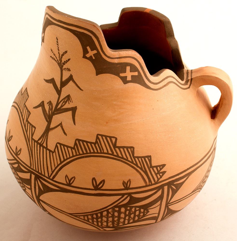 Pitcher by G. C., decorative spout and two handles. Kiva, corn designs. made with part micaceous clay. 7" x 7.5" diameter. State:New Mexico City:San Felipe Pueblo Date:2013 ID# 49416