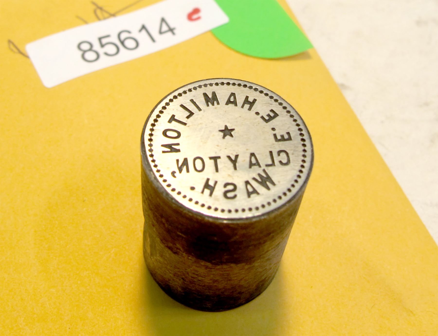 Token die identified from Clayton, WA. 24mm: EE Hamilton. Northwest Territorial Mint Token Die Collection. State: Washington City: Clayton Date: c1903-1950 HWAC# 85614