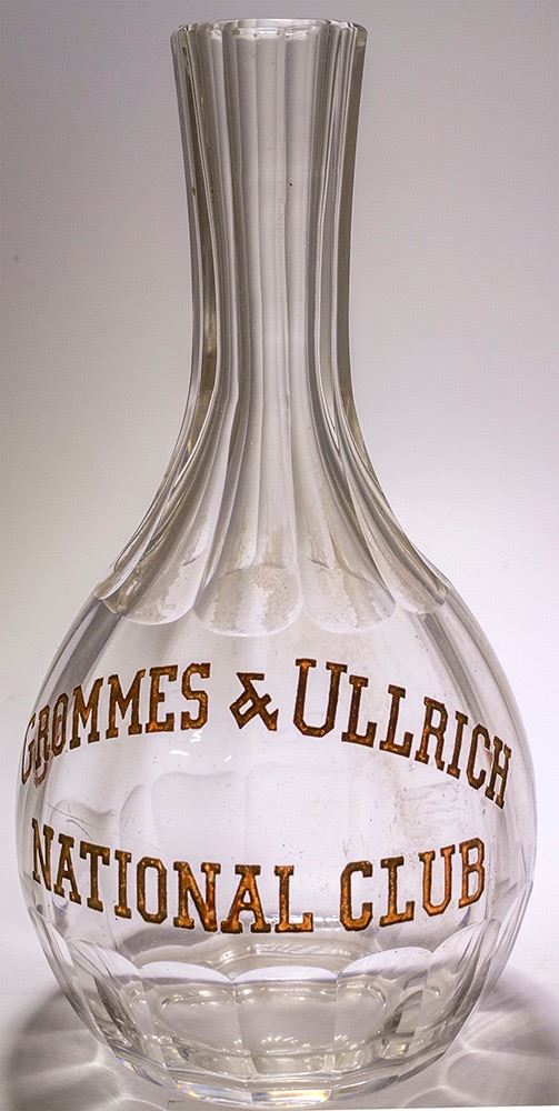 Grommes & Ullrich National Club Clear Backbar Decanter, approx 8.5 x 4 inches. No apparent chips or cracks. HWAC# 48501 Date: Location: