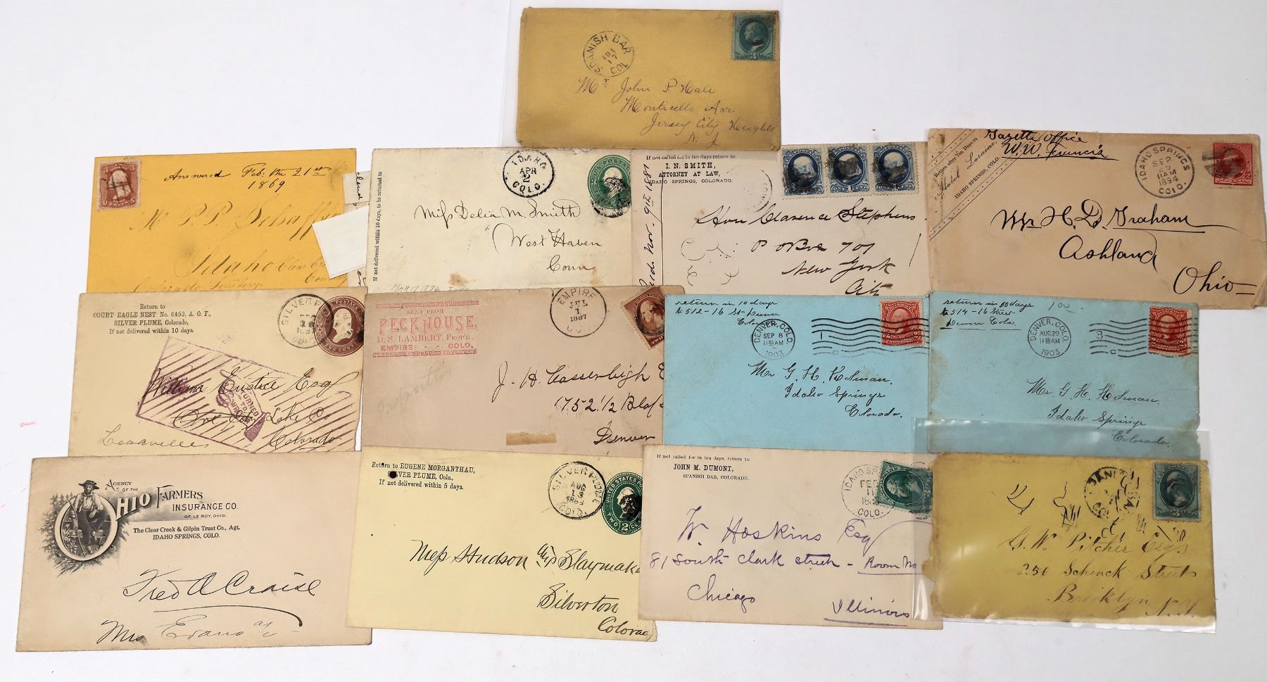 Lot of 13. 1) Idaho Springs. Seven covers. Includes: 1869 cover addressed to Idaho Springs, Colorado Territory; 1876 cover with letterhead for Geo. L. Cannon, Mining Engineer (letter about mining deeds); corner cover for Hotel Loraine, 1894, with letter about being "amidst a rich silver and gold mining camp...I have secured some very pretty specimens of ores..."; 1881 corner cover for IN Smith, Attorney; pictorial cc for Ohio Farmers Insurance Co.; and two covers mailed to Idaho Springs in 1903. 2) Empire. Peck House, DS Lambert, Empire, Colorado corner advertising cover sent in 1887. 3) Silver Plume. Two cc: Court Eagle Nest, AOF, 1887 to "Ore City, Lake Co., Colorado" (perhaps Leadville?); and Eugene Morganthau, 1885, to Silverton, with letter. 4) Spanish Bar. Three covers: cc for John M. Dumont, 1883; and two other covers with Spanish Bar cancels.