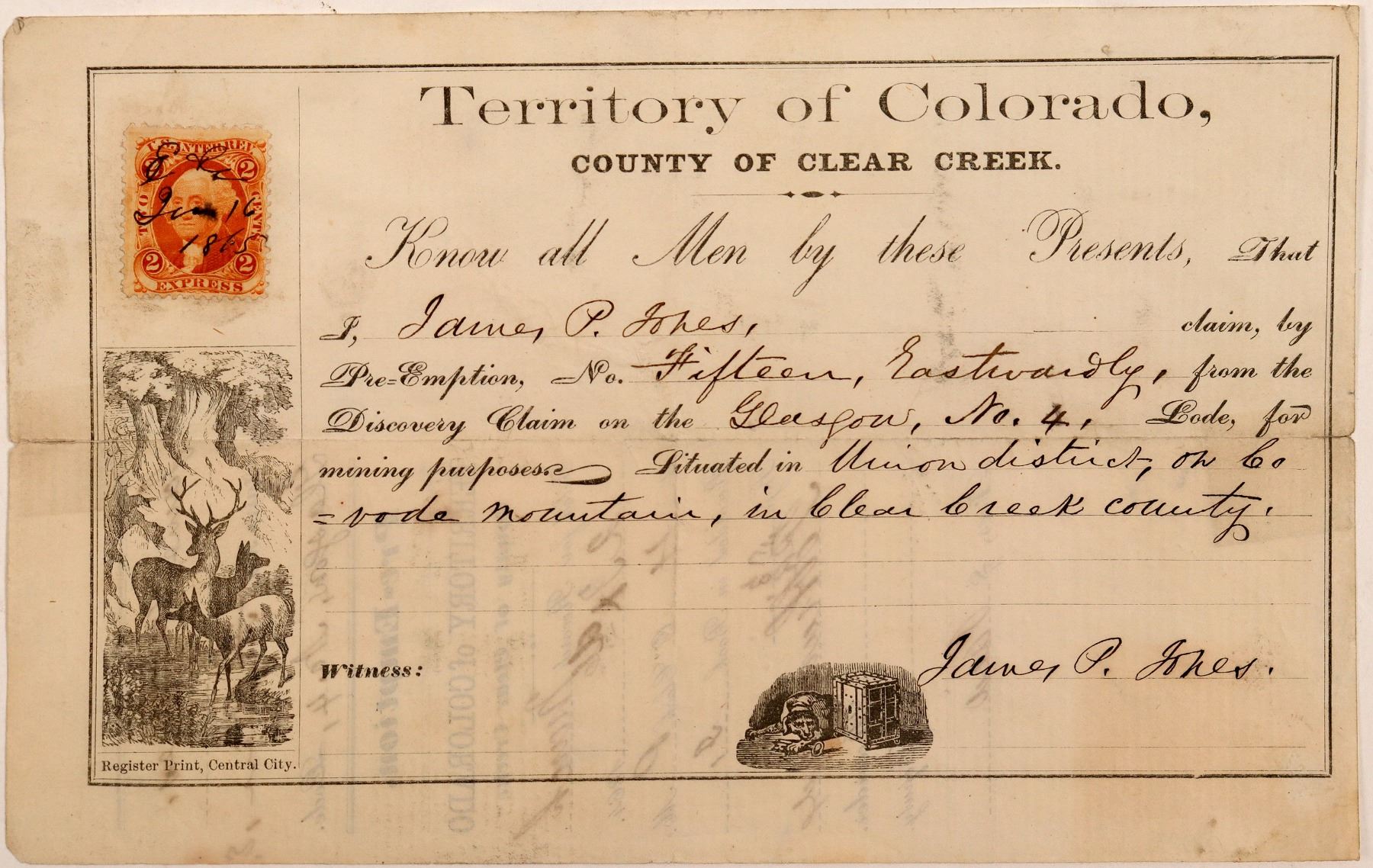 What a unique piece of early Colorado mining history! This claim was made by James P Jones. Number 15, Eastwardly of the discovery claim Glasgow, Number 4. Situated in the Union District on Covode Mountain.Printer: Register Print of Central City. Stag vignette. Small 2c orange express stamp.Located near Georgetown. The Union Mining District is in an area that includes or borders most of the middle and lower parts of Bard Creek, a tributary of the West Fork of South Clear Creek; originally bounded by the Montana district, the junction of the South and Middle branches of Clear Creek, Douglas Mountain, and Columbia Mountain. [Colorado Mining Districts by Dunn]. Covode Mountain and Silver Mountain cover the Georgetown Triangle.