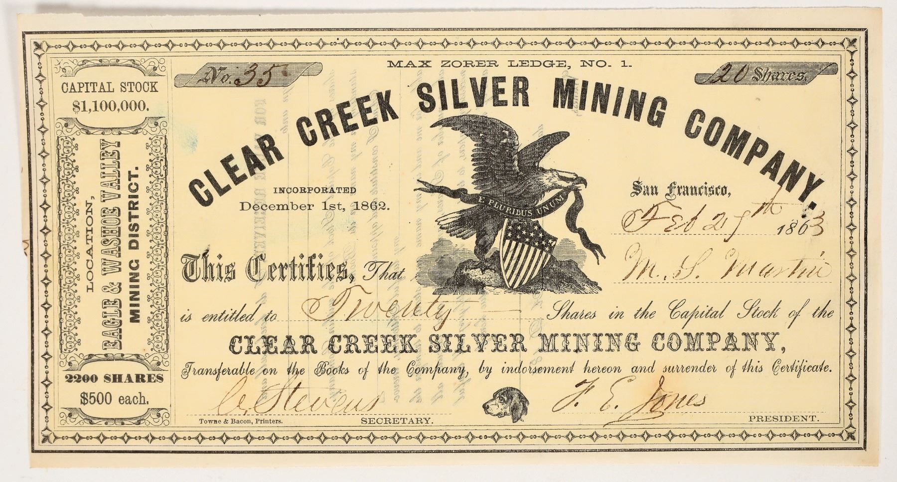 "Location, Eagle & Washoe Valley Mining District" printed at left. "Max Zorer Ledge, No. 1" printed at top center. Rare mining district! Inc. December 1862. No. 35, issued for 20 shares to MG Martin in SF in 1863. Signed by president FE Jones and secretary Stevens. Not cancelled. Black border and print on yellow paper with eagle on shield vignette. Towne & Bacon. Folds. According to King (1885), the Eagle and Washoe Valley district was organized covering this area in 1861. More recently known as the Voltaire district it is located near the base of the mountains, on the east slope of the Carson Range 3 miles west of Carson City. Most of the district is in the drainage basins of Kings and Voltaire Canyons. The Territorial Enterprise (1861) used the name Pine Forest for this area. [Mining Districts of Nevada by Tingley]