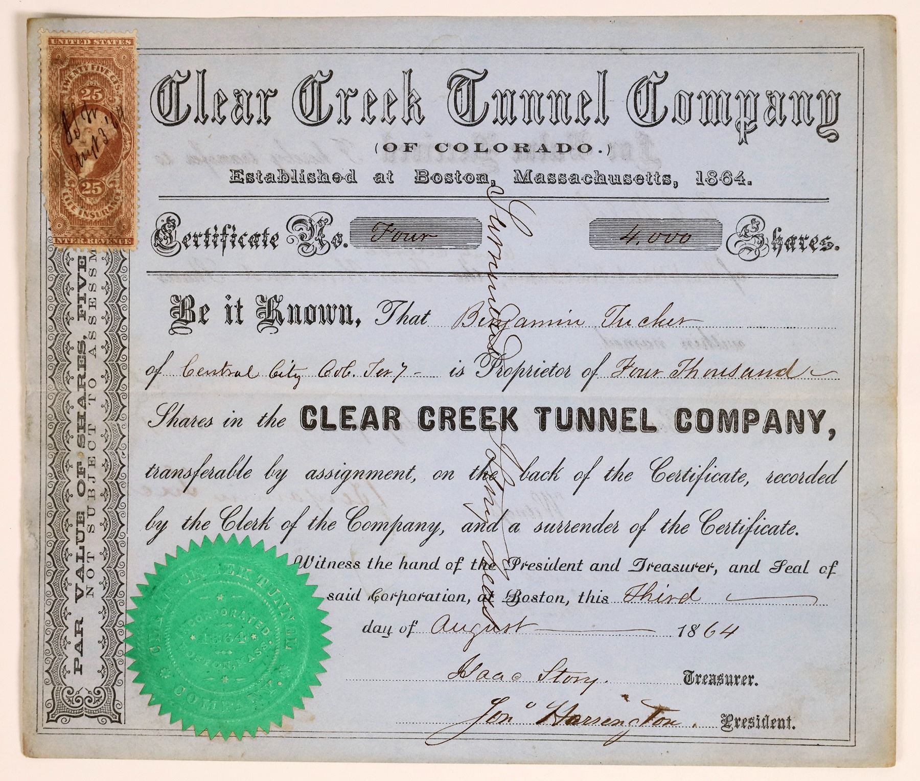 Territorial. NUMBER 4! (very early!!!) Issued in August 3, 1864 to Benjamin Tucker of Central City, Colo. for 4000 shares. Transferred to CC Welch of Black Hawk Point Gilpin. Signed by Harrington, and Isaac Story. Incorporated in 1864 in Massachusetts. 25c Life Insurance revenue stamp. Green corporate seal. Hand cancelled. The Clear Creek Tunnel Company own 600 feet on the Kinney Tunnel Lode, on North Clear Creek, in Black Hawk. Adit driven in on creek level and on vein 60 feet, crevice of gossan six feet wide with thin streaks or formations of very rich ore, assaying as high as $600 per ton in gold, improving rapidly. Also a mill site on the creek at mouth of adit, dwelling house and lot nearby, and 2 5 horse engine now in use in a saw mill at Guy Hill. [Hollister, p189]