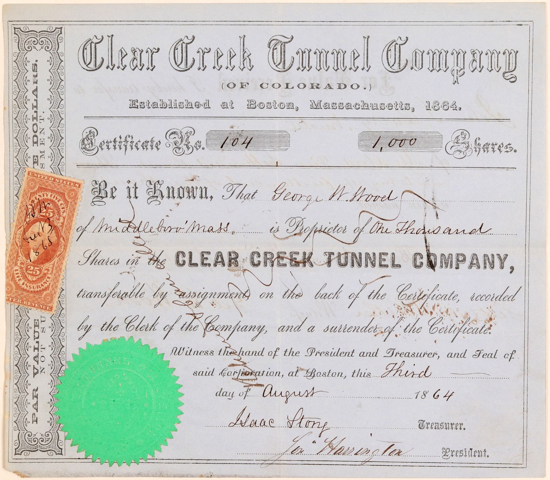 Stock Certificate from the Clear Creek Tunnel Company of Colorado. Incorporated in 1864 in Massachusetts. Certificate number 104, issued in August 3, 1864 at Boston to George W Wood. Signed by president Harrington and Isaac Story. Size 8 by 6.5 inches. Canceled. 25c Life Insurance revenue stamp. Green corporate seal. Hand cancelled. Reverse has a note that the first 500 shares go to John L Barry, trustee. "The Clear Creek Tunnel Company own 600 feet on the Kinney Tunnel Lode, on North Clear Creek, in Black Hawk. Adit driven in on creek level and on vein 60 feet, crevice of gossan six feet wide with thin streaks or formations of very rich ore, assaying as high as $600 per ton in gold, improving rapidly. Also a mill site on the creek at mouth of adit, dwelling house and lot nearby, and 2 5 horse engine now in use in a saw mill at Guy Hill." [Hollister, p189] Nice condition.