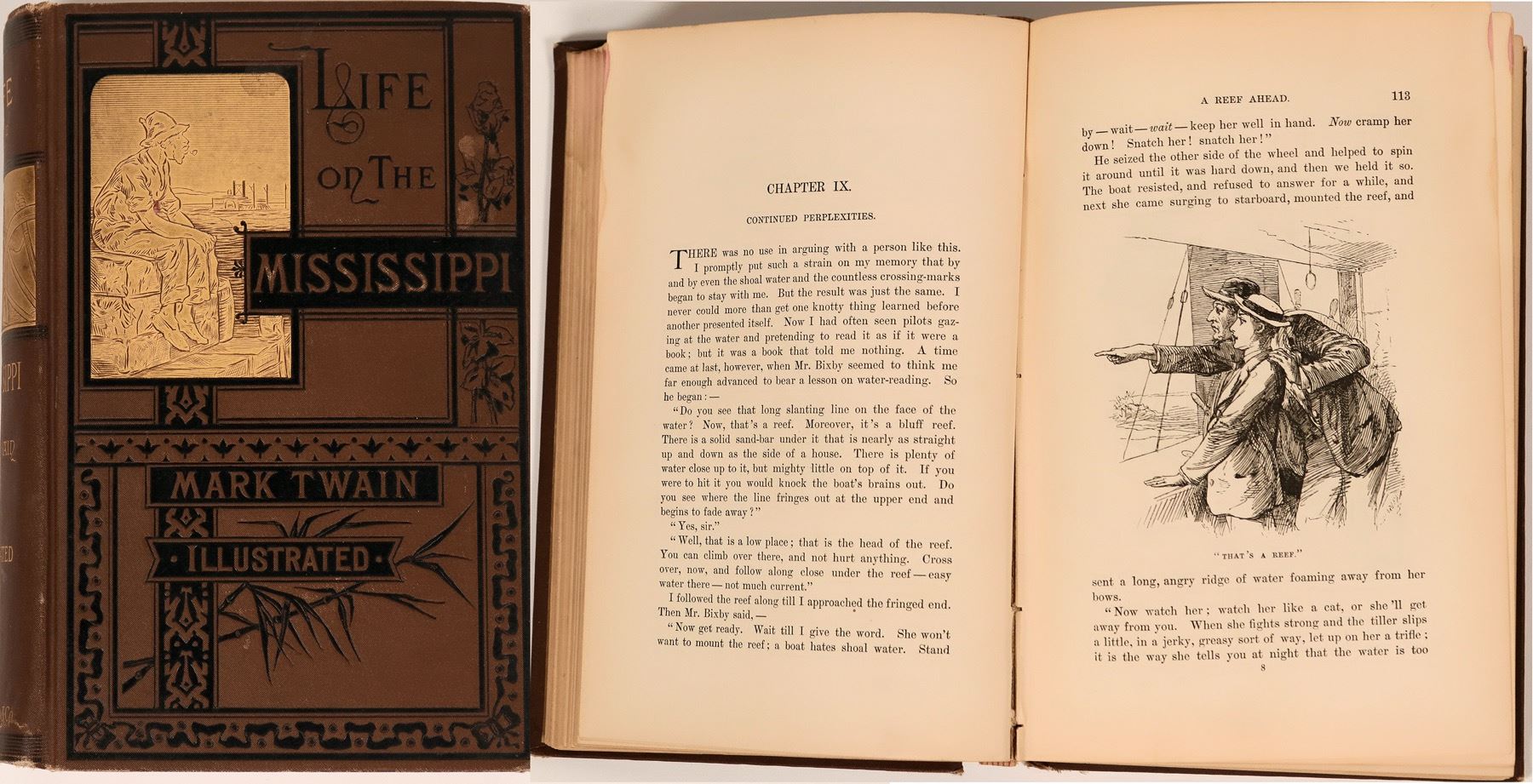 Very fine copy of this Clemens masterpeice, describing every aspect of a Mississippi River paddlewheerer. He writes of everything from the onboard gamblers (including the cheaters), personnel, travelers, events and mishaps, such as the boiler explosions that killed people, including his brother in real life, though that is not mentioned. Bright gilt and colors. Sound copy.
