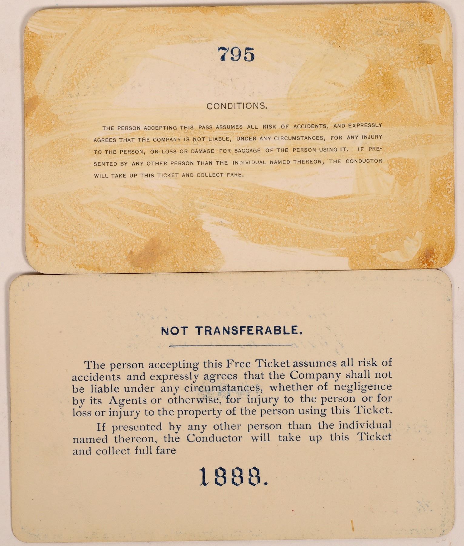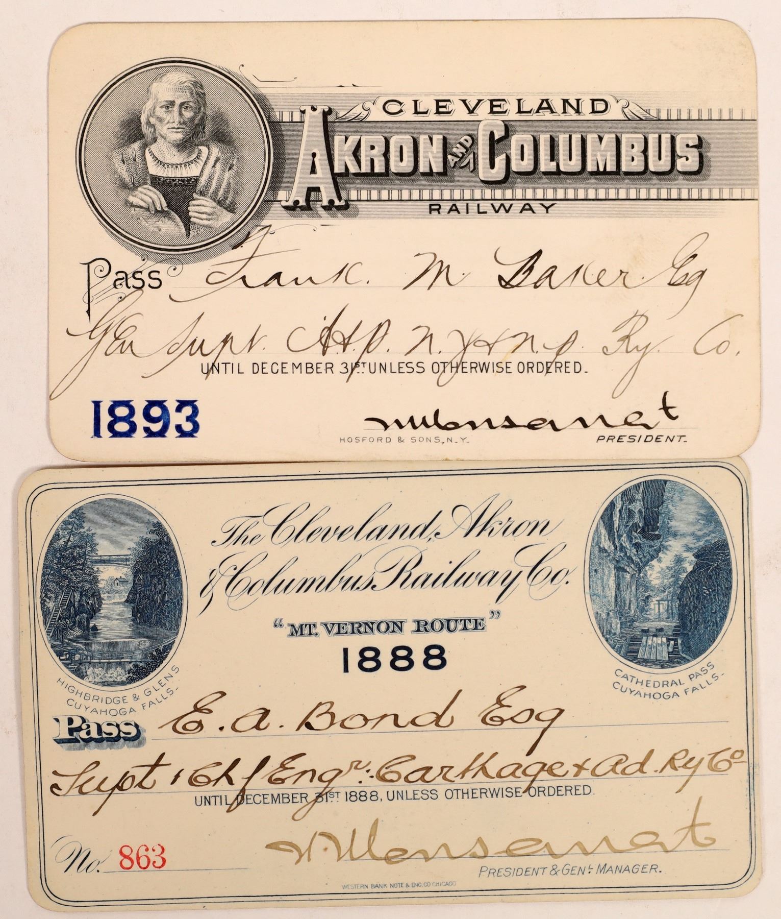 Lot of 2 different. "Mt. Vernon Route." 1) No. 863, issued to EA Bond in 1888. Signed by the president. Blue print on cardstock. Vignettes of Cathedral Pass, Cuyahoga Falls, and Highbridge & Glens. 2) No. 795, issued to Frank Baker in 1893. Signed by the president. Vignette portrait of Columbus. Glue residue on reverse.
