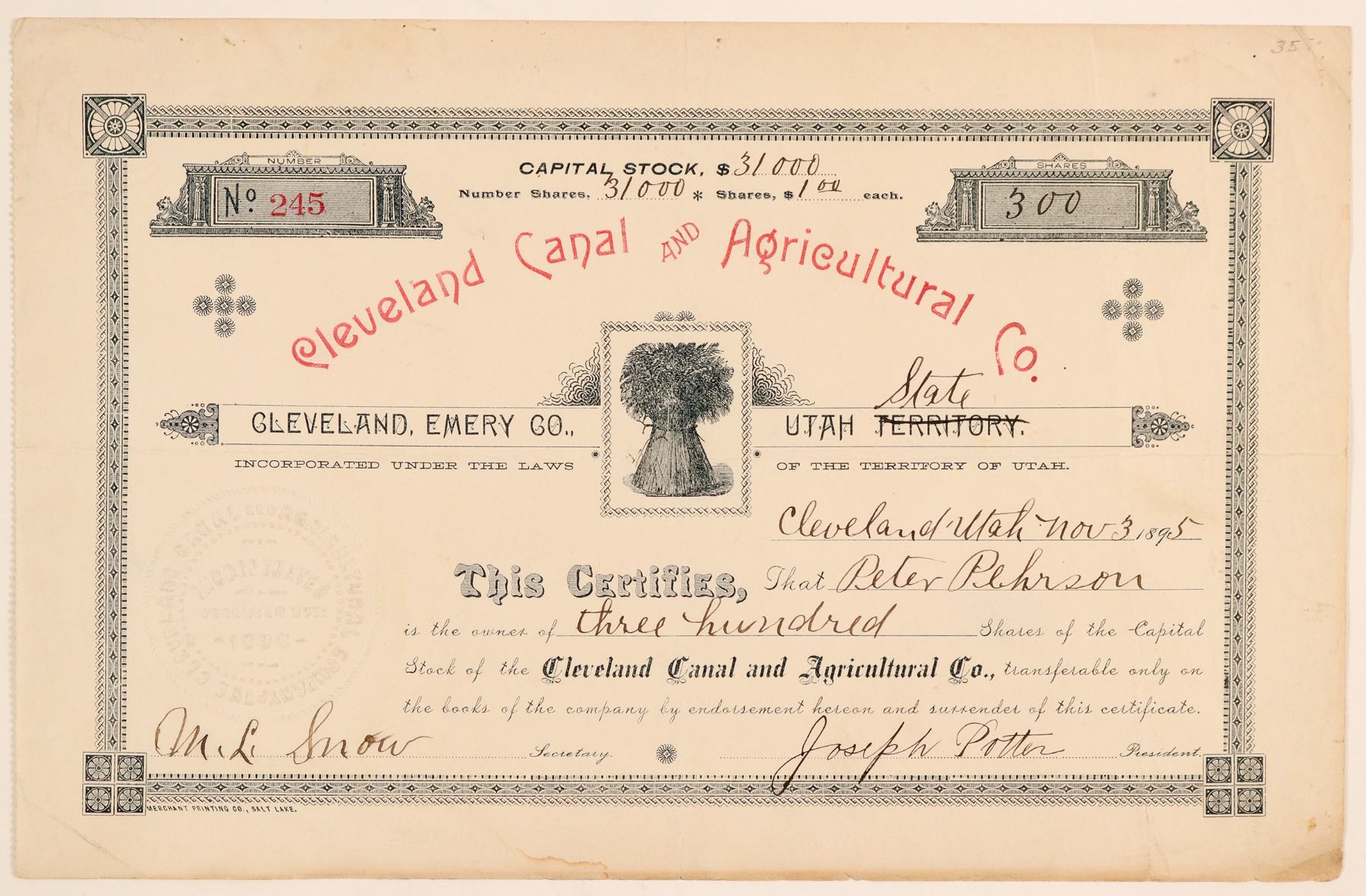 Cleveland, Emery Co., Utah State (Territory crossed out). Dateline Cleveland, Utah, Nov. 3, 1895. No. 245, issued for 300 shares to Peter Pehrson. Signed by president Joseph Potter and secretary M.L. Snow. Not cancelled. Black border and print, red title. Small agricultural vignette. Printed by Merchant Printing Co., Salt Lake. 6.75 x 10.5" Folds, creased corners, some staining around edges. Samuel Alger surveyed the route of the Cleveland Canal in 1885. During the four years of construction, a cooperative arrangement was developed whereby some men worked in the mines and contributed to the living expenses of others who worked on the canal. The canal as originally completed was twenty-five miles in length, much of it through rock ledges and shale hillsides, and at a cost reported at $530,000. [Ref: Utah Centennial County History Series] Ken Prag Collection