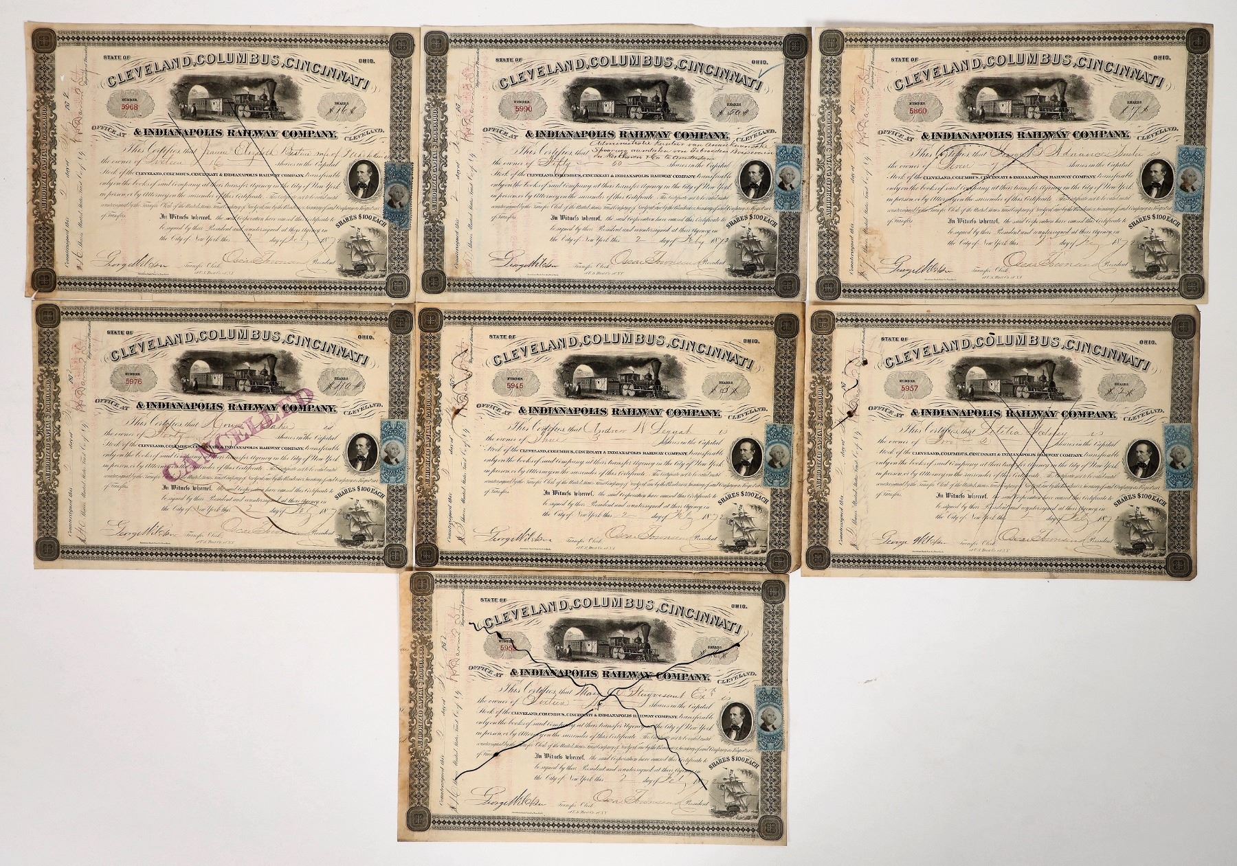 7x 1872 Cleveland, Columbus Cincinnati & Indianapolis RW stocks. Adhesive RN stamps.
