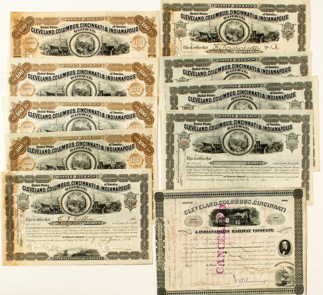 Lot of ten. Three different types. Earliest is very different than the rest. It was issued in 1880 and is punch and stamp cancelled. It features a locomotive vignette. The other nine fall into two types: black (5) or brown (4) border. Two black are issued (1883 and 1887), and two brown are issued (1885 & 1887). All nine have the same large vignette at top of a shipping yard scene. All are punch cancelled. Please inspect. (Prag Collection) City: State: Ohio Date: 1883-1887 ID# 33941