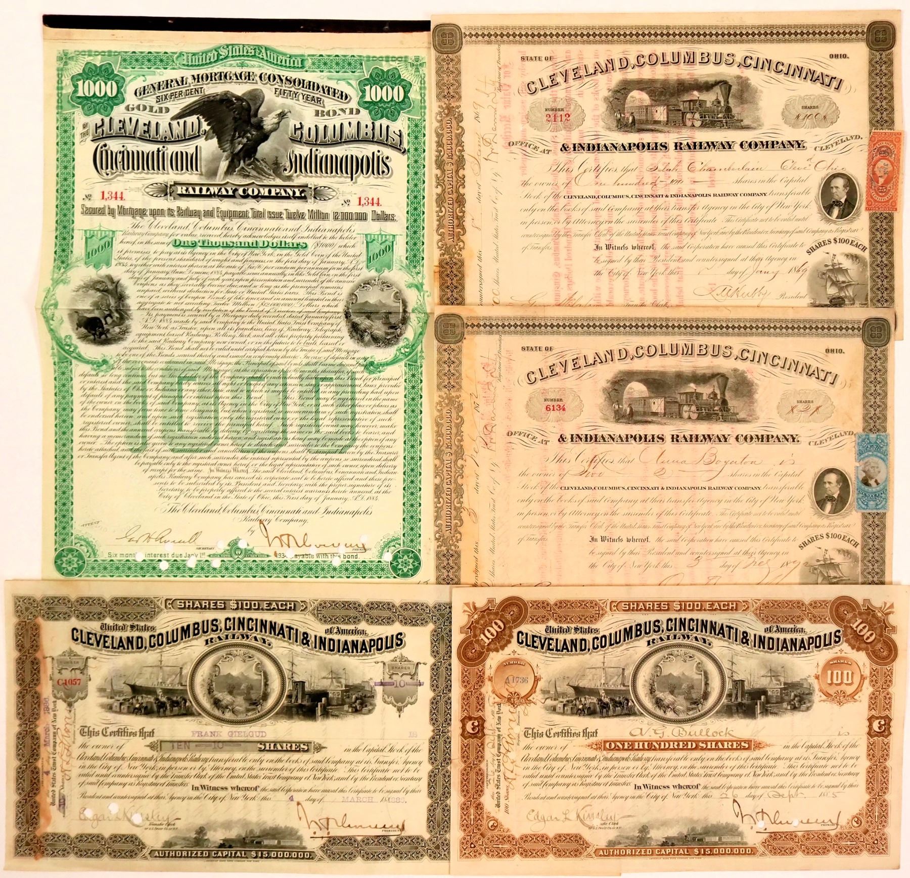 Nice group from this railroad. Includes: Certs # 2112, issued in 1869 and #6134, issued in 1872. Black on creme. Train going under bridge, two workers to the side, both with revenues, I/U; cert. A1736, issued 1885 and C1057 issued in 1886, both signed by John Devereux as president. Devereux was an important midwest railroad executive and was the U.S. Railroad Military Superintendant during the Civil War (coxrail.com). Both with hole cxls. through Devereux's signatures. The bond certificate #1344, was secured by a Railway & Equipment Mortgage. $1,000, 6%, 50 yr. gold bond issued 1884. Also signed by Devereux with hole cxls. affecting his signature. No coupons.