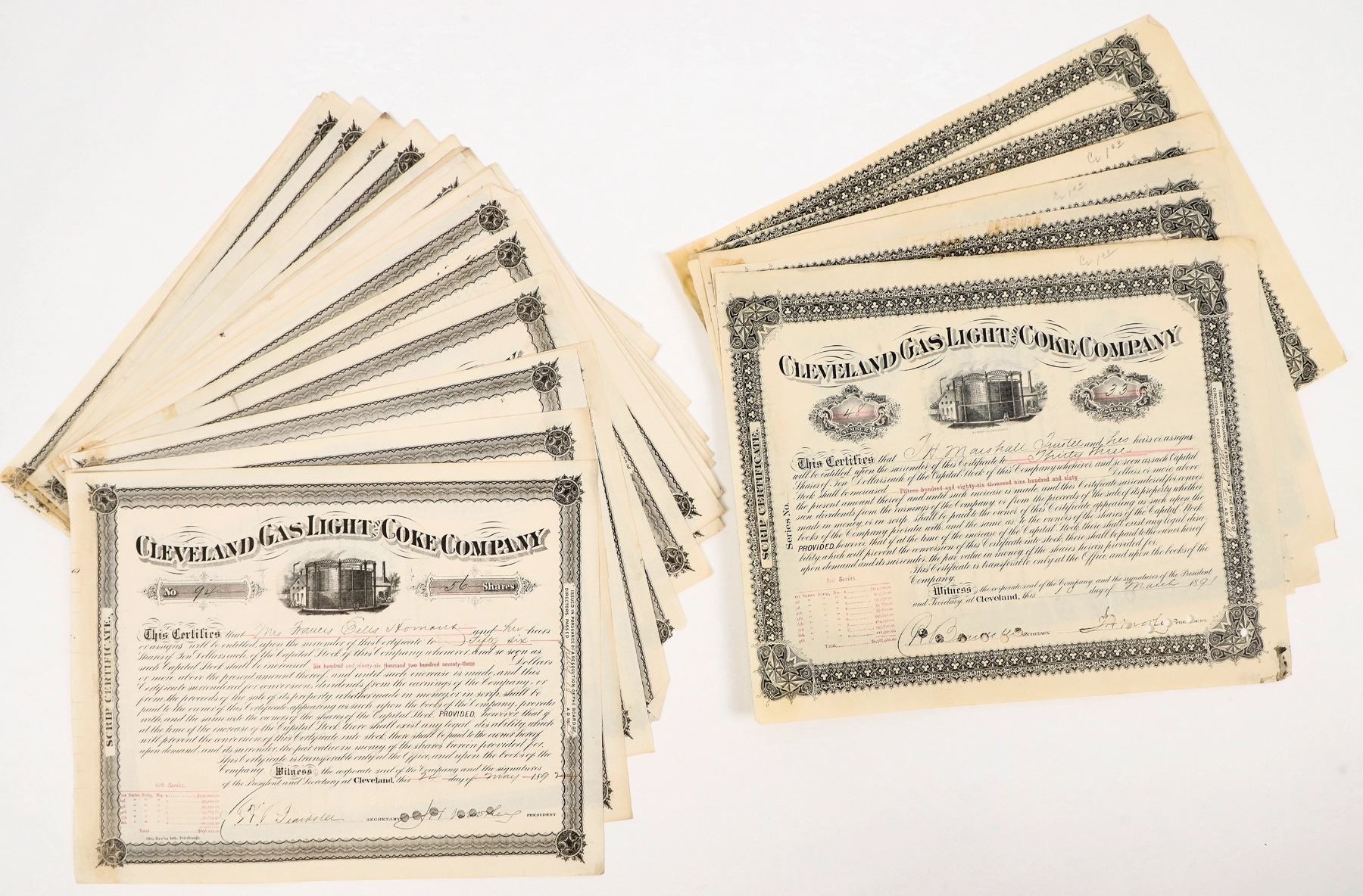 About 25 issued stock certificates from the Cleveland Gas Light & Coke Company. Black ink, industrial vignette.