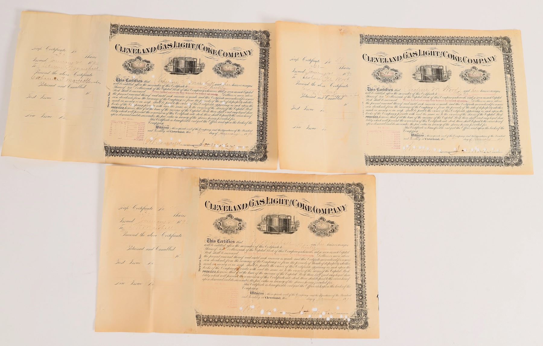 Lot of 3 stocks issued in 1890, all punch cancelled. Identical design: black border and print, vignette of gas facility? Printed by WJ Morgan & Co., Cleveland. All with stubs. Toning. 9 x 15" The Cleveland Gas Light & Coke Company, incorporated Feb. 1846, dominated gas service on the eastern side of the Cuyahoga. Cleveland Ohio