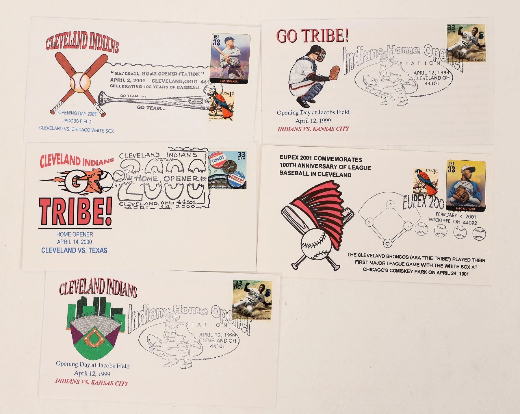 Opening Day First Day Covers for the Cleveland Indians at Jacobs Field. These include 1999 (2), 2000 & 2001. They also have baseball themed postage stamps, including Jackie Robinson, Satchel Paige, & Tris Speaker. They are very clean. Please see photos for more details.[ Cleveland Ohio
