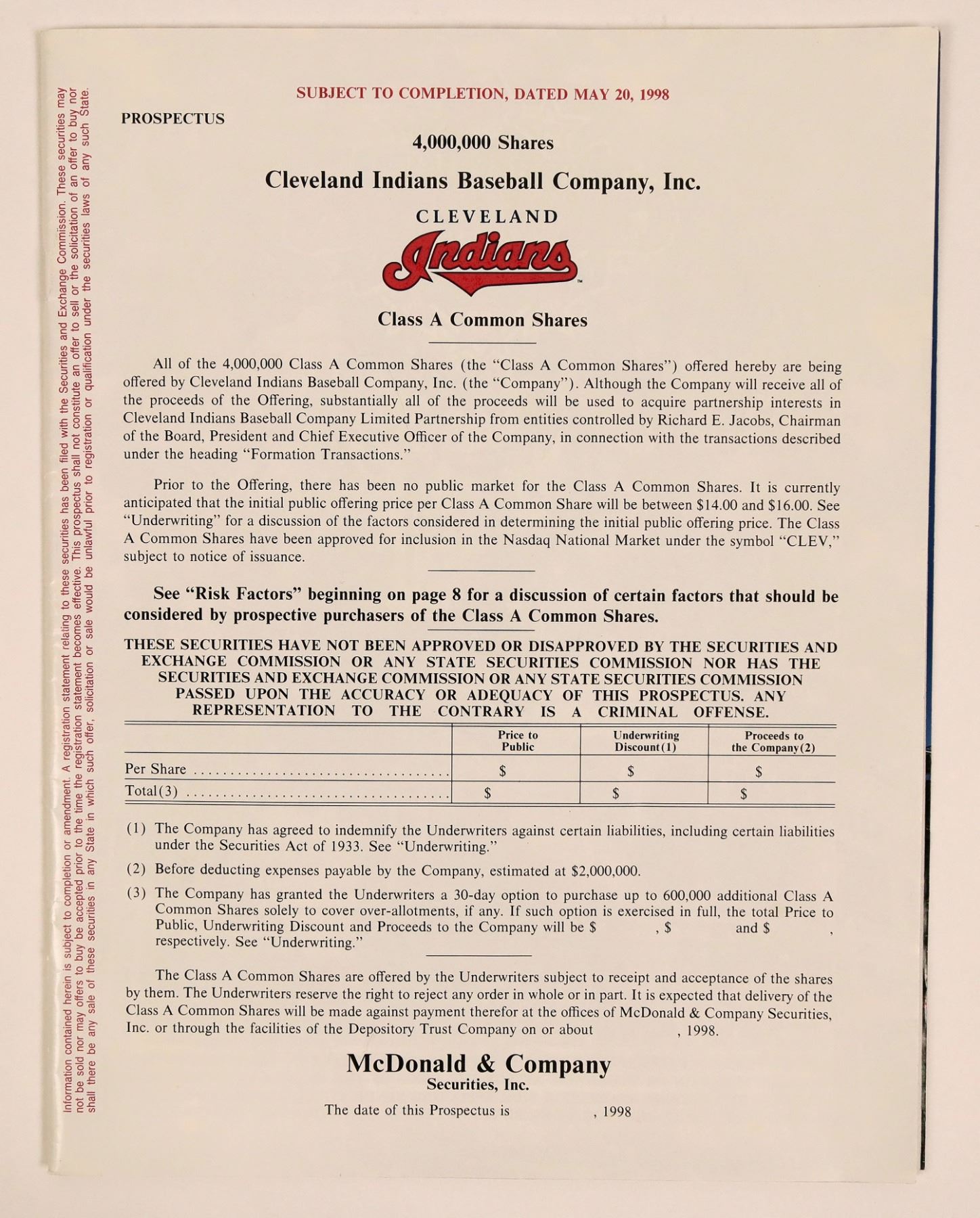 This is a great baseball collectible. Very few sports teams ever go public with a stock offering. The Cleveland Indians issued stock in 1998 and this is a rare prospectus for the offering. Color pictures on the inside front and the inside back covers of the team in celebration mode and of the packed stadium. It's very rare to get the financials from a major league sports team in any sport. In 1997, the team did $140 million in revenues and had net income of $22.5 million. 66 pages plus an index. VF.