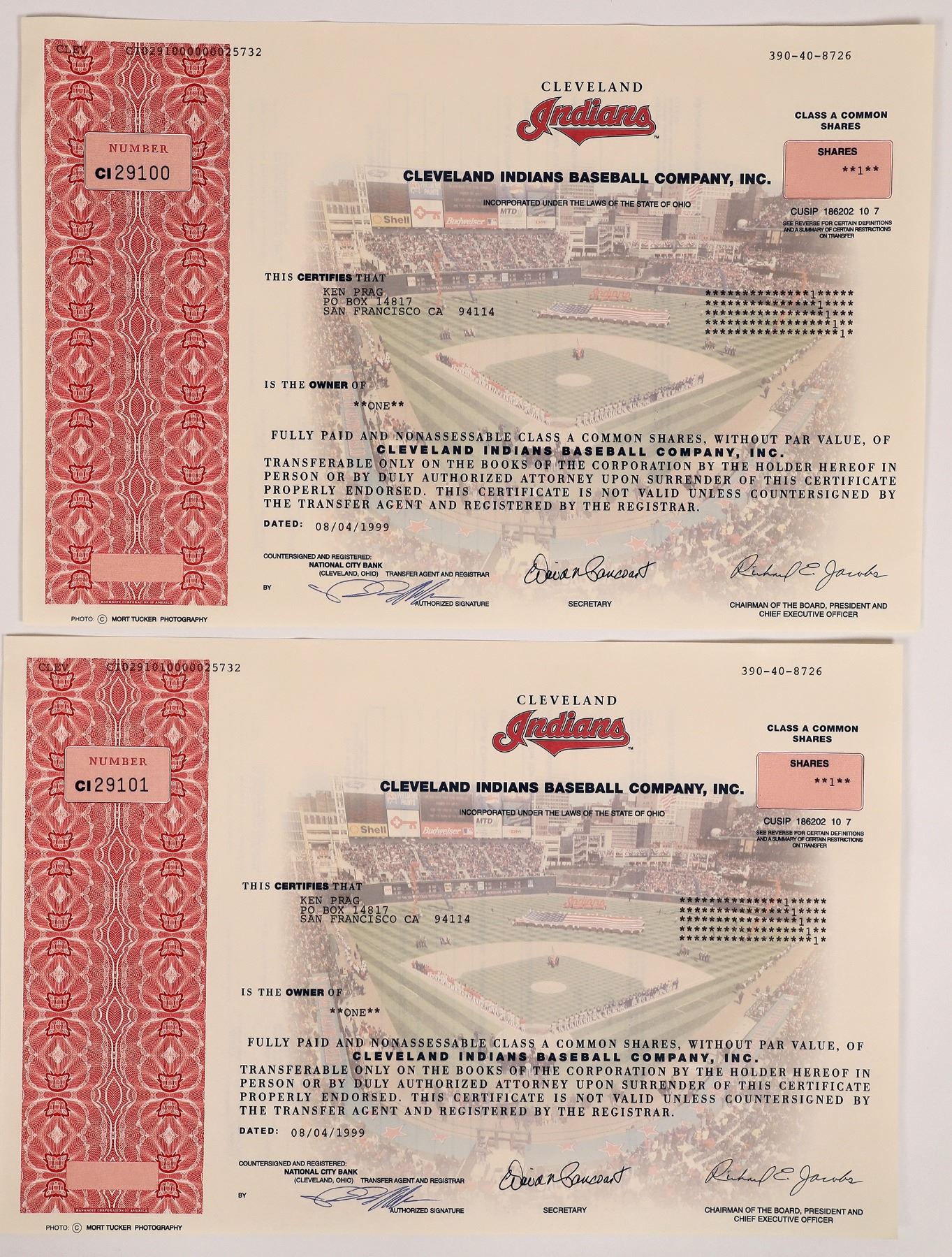 Lot of 2. Each is issued for one share in 1999 to Ken Prag. Signed by Secretary and Chairman of the Board, President and Chief Executive Officer. Not cancelled. Red left border and team logo. Nice underprint color picture of baseball field with American flag showing people in bleachers. Printed: Banknote Corporation of America. 8 x 12" The Cleveland Indians are an American professional baseball team based in Cleveland, Ohio. They compete in Major League Baseball as a member club of the American League, Central Division. They have competed at Progressive Field since 1994 with spring training held at Goodyear Ballpark in Goodyear, Arizona. Became a major league franchise in 1901 and have won 2 World Series championships in 1920 and 1948 since then.