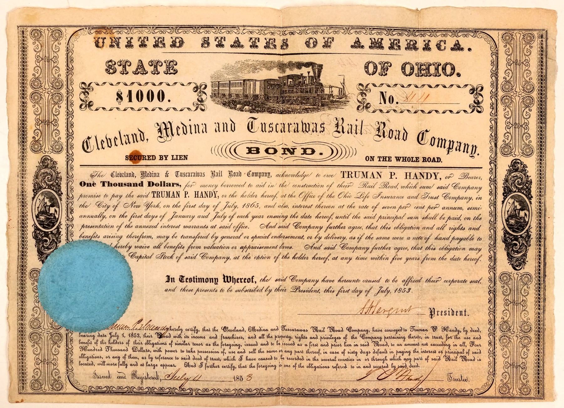 Cert. #44, $1,000, 12 year bond issued in 1853. 7%, black on white. Seventeen coupons at the bottom. Steam engine runs left to right. The bond was secured by a lien "On The Whole Road." Small circle burn spot over the word "secured" in the header. Vertical fold lines.