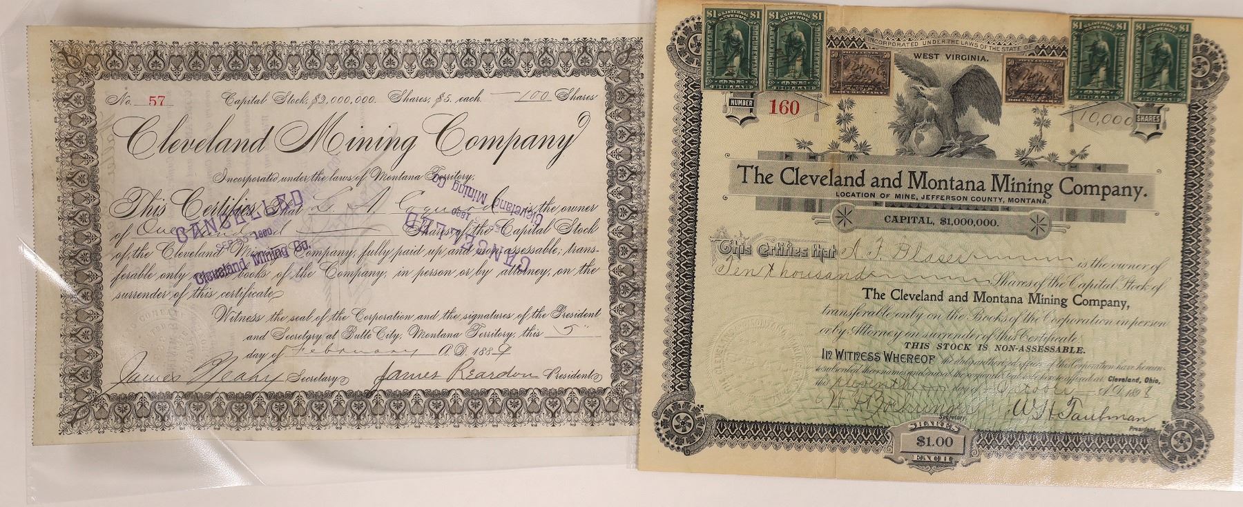Lot of 2 different. 1) Cleveland Mining Company. Inc. in Montana Territory. No. 57, issued in 1889 in Butte City. Signed by president James Reardon and secretary James Leahy. Stamp cancelled. Black border and print. Pinholes, folds. The company was based in Butte but the mines (the Cleveland and the Anchor) were located in the Alton Mining District in Idaho. 2) The Cleveland and Montana Mining Company. "Location of Mine, Jefferson County, Montana" (printed under title). Inc. in West Virginia. No. 160, issued in 1898 for 10,000 shares in Cleveland, Ohio. Signed by president WH Taulman and the secretary. Not cancelled. Black border and print, eagle vignette. Six adhesive revenue stamps. Deep folds, toning.
