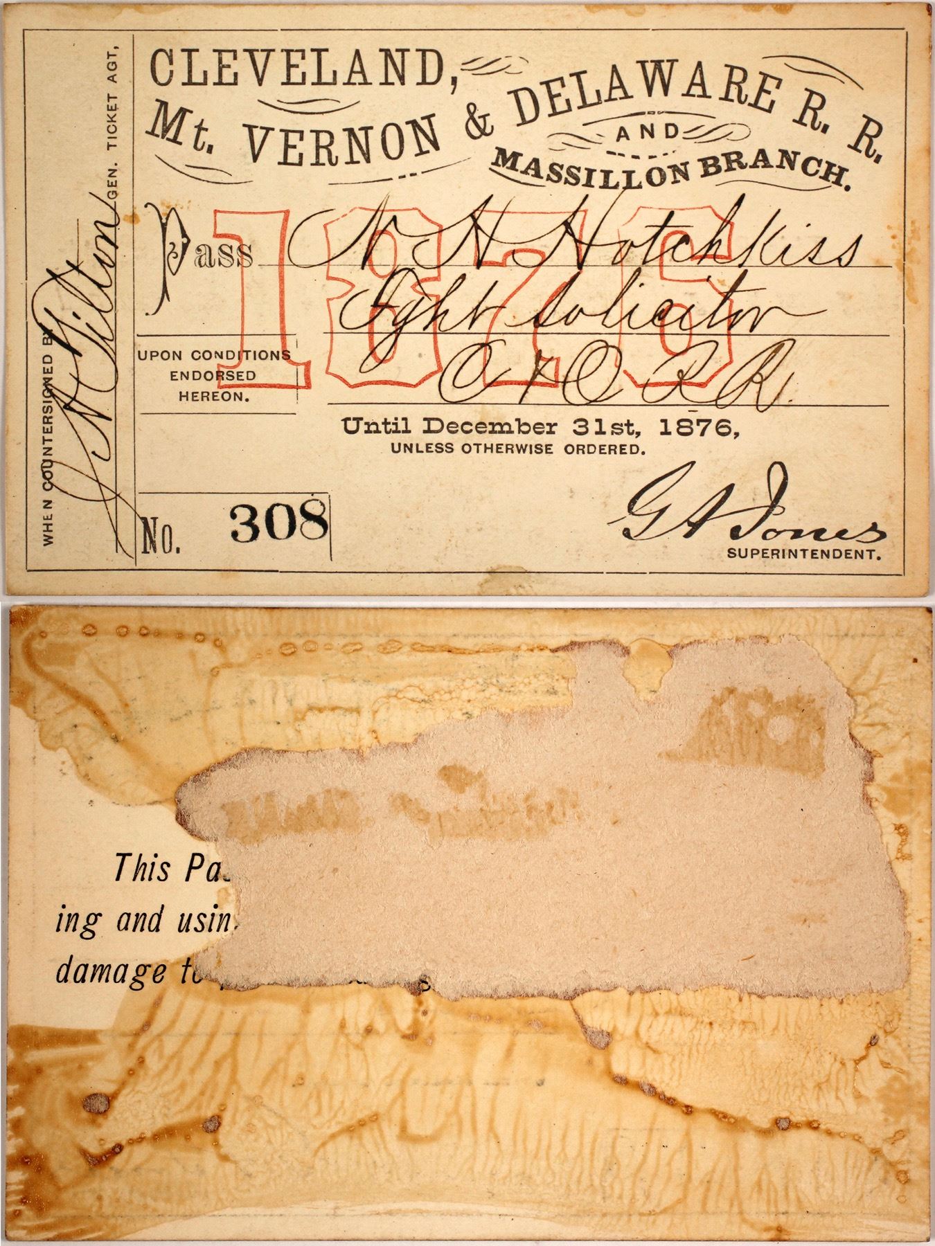 Includes Massillon Branch. Pass No. 308, issued for 1876 to N.H. Hotchkiss, freight solicitor for Chesapeake & Ohio Railroad. Printed signature of G.A. Jones, superintendent. Countersigned by J.A. Tilton. Reverse has significant glue and paper residue. The 1869 reorganization of the Cleveland, Akron & Columbus Railroad. The main line (originally referred to as a branch from Mt. Liberty to Columbus) was completed between Millersburg and Columbus and trains began running to Columbus on September 1, 1873. The Dresden branch was completed in 1888 including a 1,500' tunnel near Tunnel Hill. The branch extended from Killbuck to Trinway with trackage rights to Dresden and Zanesville. (Potter Collection)