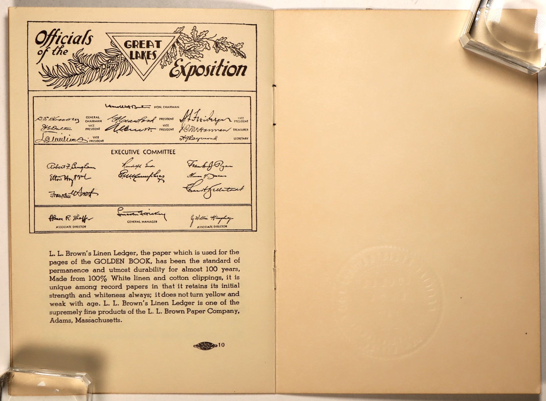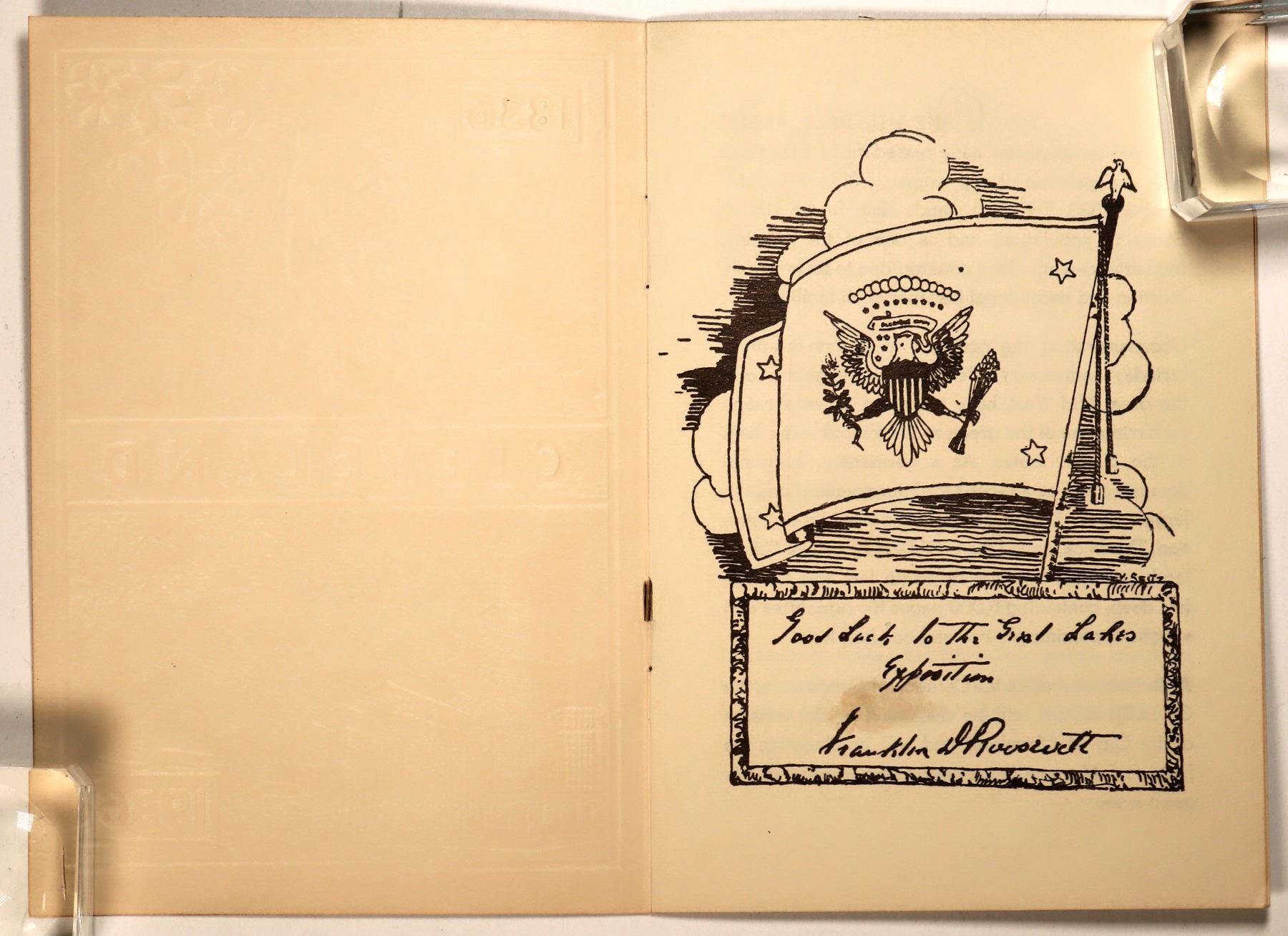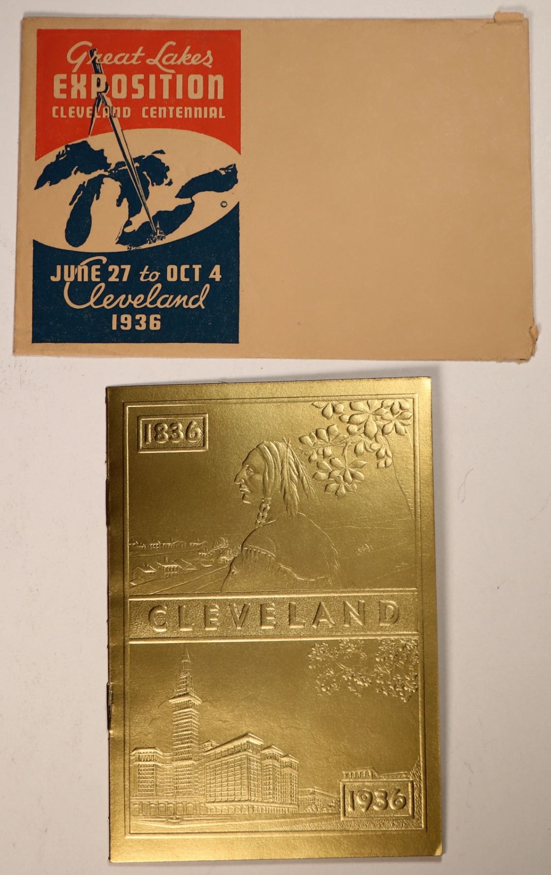 Great Lakes Exposition Cleveland Centennial cover & booklet. Cover has Red & Blue graphic with map of Great Lakes & date, June 27 to Oct. 4, Cleveland, 1936. Gold gilt booklet that came with cover embossed, "1886/Cleveland/1936" on front, 4 inside pages with printed Franklin D. Roosevelt autograph page 1. "Official Registration Book/Golden Book Inc./Exhibition" seal embossed on reverse.[ Cleveland Ohio