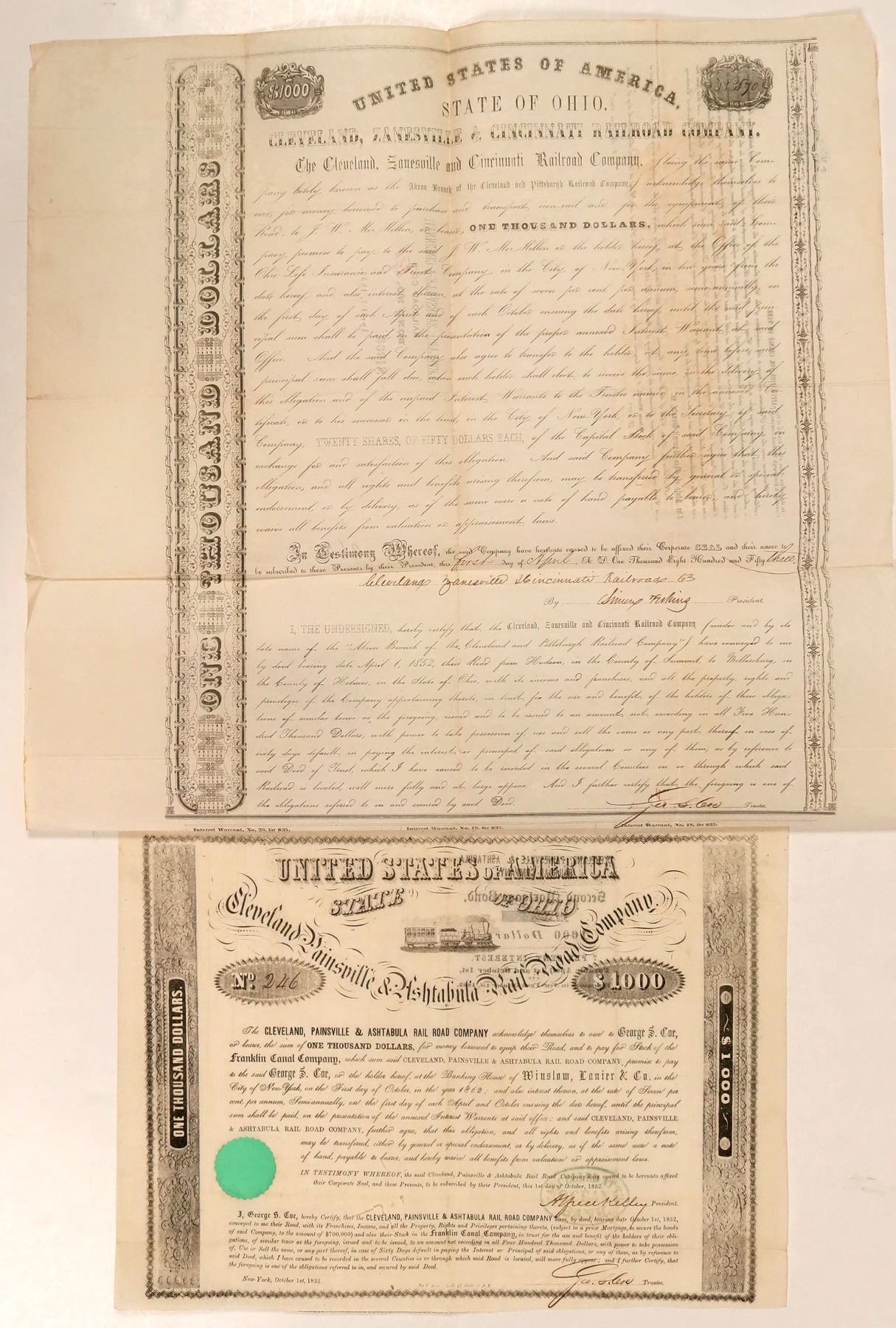2) Cleveland, Painsville & Ashtabula Rail Road Co bond cert. #246, $1,000, 7%, 10 year bond matured in 1862. Small train runs left to right. Circular stamp cxl. over president's signature.