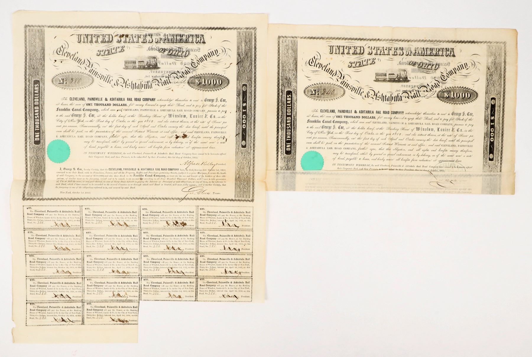 These are three bonds for the Cleveland, Painsville & Ashtubula Railroad Company. Second mortgage bonds 1852. Please see photo for details.
