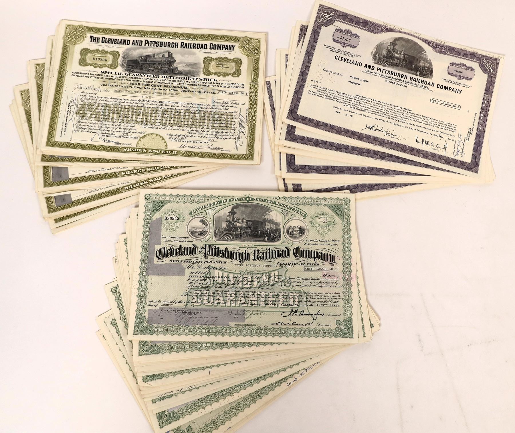 Lot of approx. 100 issued stocks, three varieties. Includes: 50 green border, 1960s-1970s; 20 purple border, 1970s; and 30 light green border, 1970s. All with locomotive vignette.