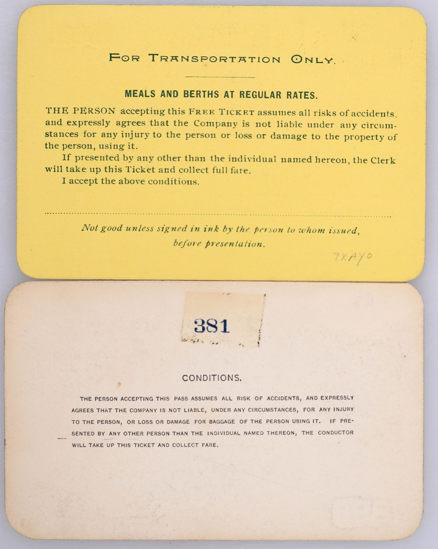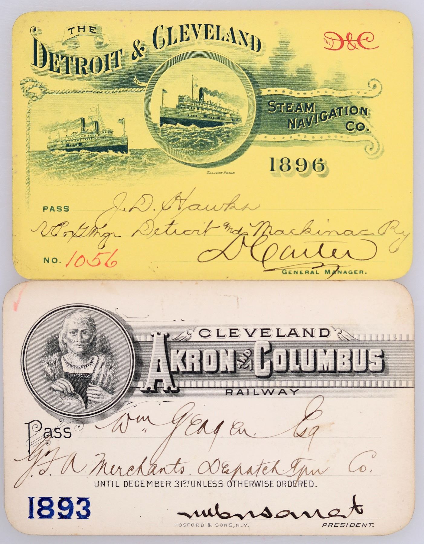 Lot of 2 different. 1) Cleveland, Akron & Columbus Railway. Pass issued for 1893 to Wm. Geager of Merchants Despatch Transportation Company. Vignette of Christopher Columbus. Signed by the president (illegible). Printed on cardstock. 2) Detroit & Cleveland Steam Navigation Company. Pass issued for 1896 to JD Hawks. Signed by general manager D. Carter. Printed on yellow cardstock with double steamship vignette. Lake Erie Division between Detroit and Cleveland.
