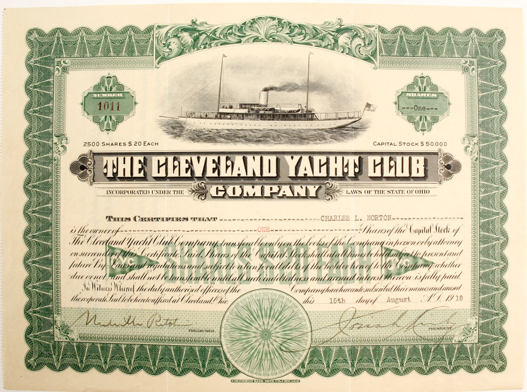 Choice I/U #1011 Charles Norton 1 share 1918 signed by President Kirby. Inc in OH. Yacht vignette. Prag Collection. State: Ohio City: Date: 1918 HWAC# 83373
