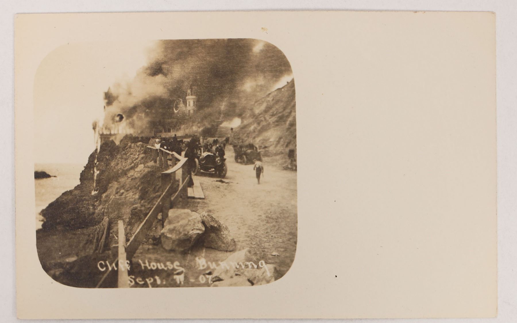 A real photo postcard depicting the burning of San Francisco's famous Cliff House resort in 1907. The photo has the text 'Cliff House Burning, Sept 7 - 07' inscribed on the bottom. The card is never used and is in excellent condition.