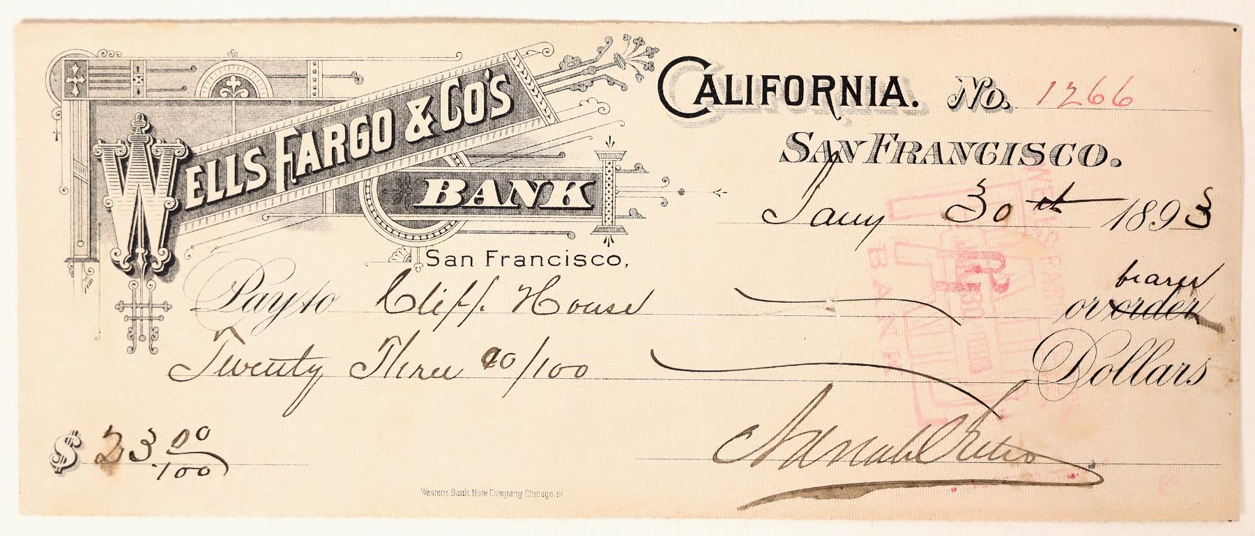 Adolph Sutro owned Cliff House and this is a rare Sutro and Cliff House tie in. 1893 check to Cliff House signed by Sutro. [San Francisco] [Colorado]