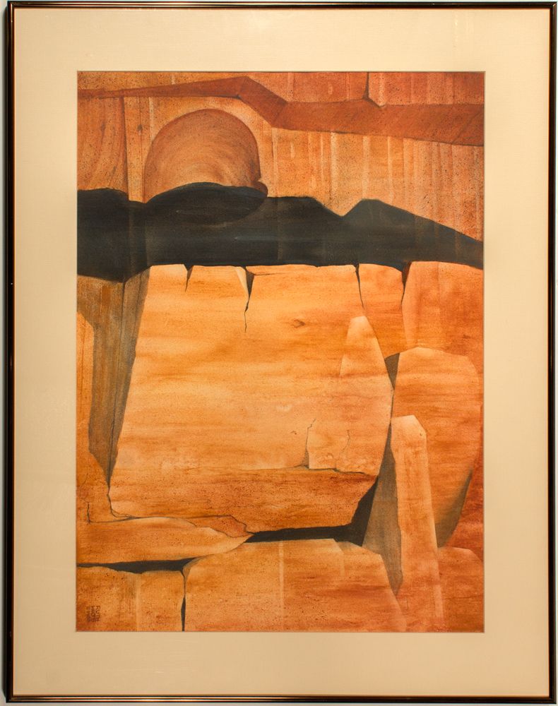 Framed: 28 x 36" Nevada Earth Colors series by Ruth Hilts. A Native Nevadan, Ruth Hilts worked in several mediums over the years. The paintings reflect her love of the high desert country. She is noted for her "Nevada Earth' series in which she made pigments from soils, rocks and minerals of the Nevada desert. She has received several awards for her work, and her paintings are in many corporate collections, including the Nevada Museum of Art.