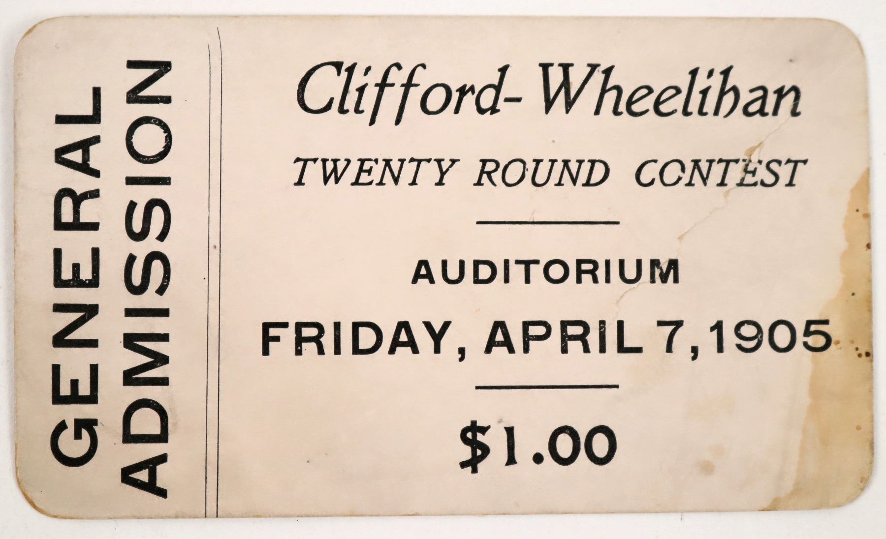 1905 Clifford vs. Wheelihan twenty round contest boxing ticket. Jack Clifford was victorious in less than 1 minute in this brutal match. 2.25x4", lower right stain and 1 3/8" center tear.On heavy stock, like a business card.
