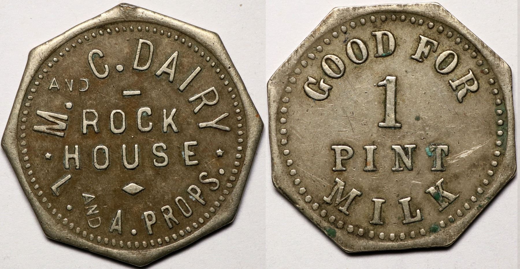 M and C Dairy / Rock House /L and A Props // GF / 1 / Pint / Milk. Octagon, Brass, 25mm, R10.