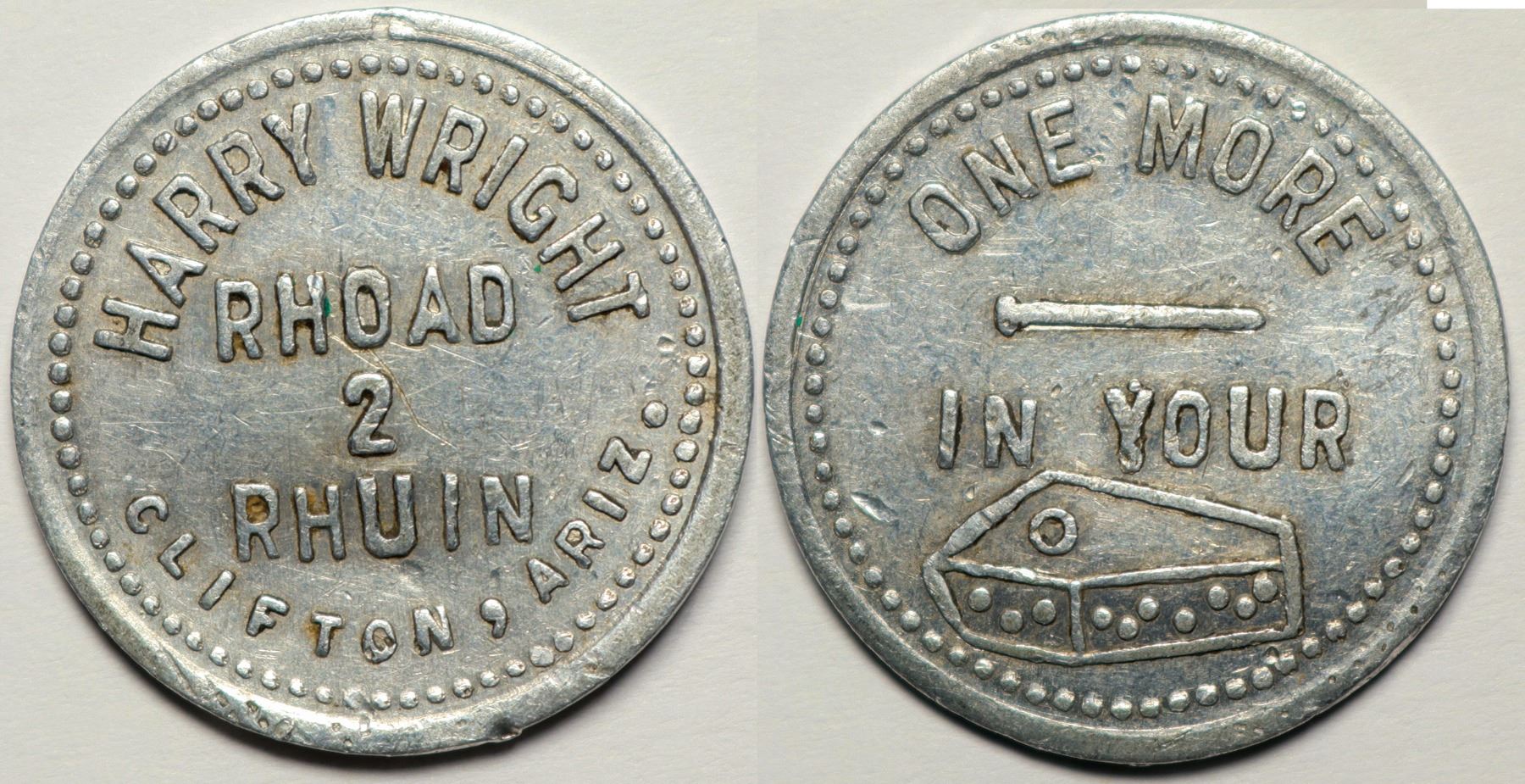 Choice pictorial token. Harry Wright / Rhoad / 2 / RUIN / Clifton, Ariz. // ONE MORE / (nail vignette) / IN YOUR / (coffin vignette). 9mm, Wm. One of the great western tokens!