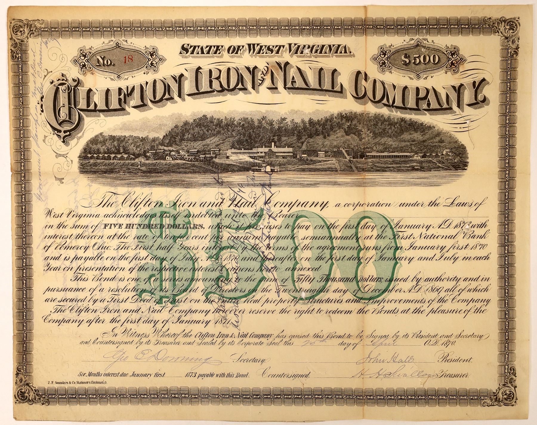 Clifton Iron and Nail Company bond issued April 25, 1870. Company incorporated in State of West Virginia. Parchment, 12" x 9 1/2" bond has spectacular vignette of a river scene with ferry boat, manufacturing company and housing, with ornate border and embossed seal. Signed by President John Hale, Secretary Geo E. Downing, and Treasurer H. H. Swallow. In fine condition with age related staining along slight folds, minor tears on fold edges and four small holes.