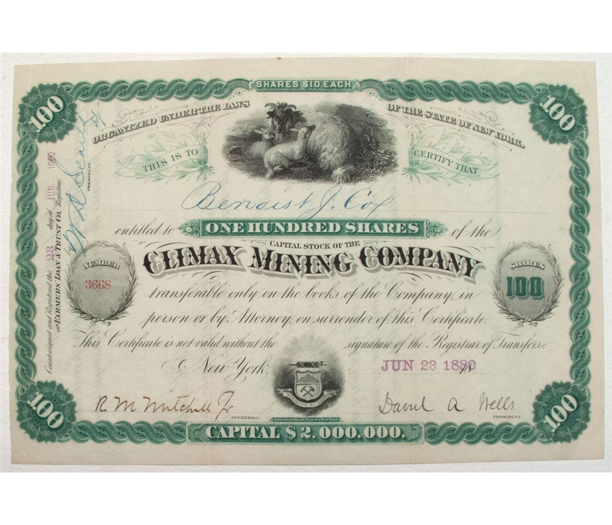 Incorporated in New York. Cert. # 3668 issued to Benoist J. Cox for 100 shares. Signed by Daniel A. Wells, president, and R.M. Mitchell, Jr., secretary. Two vignettes: large sheep with lamps at center and Colorado State seal at bottom. Green border on crme paper. U/C. Printer: ABNCo., New York. Datelined New York. Two fold creases. XF. Date Leadville, CO hwac 9976