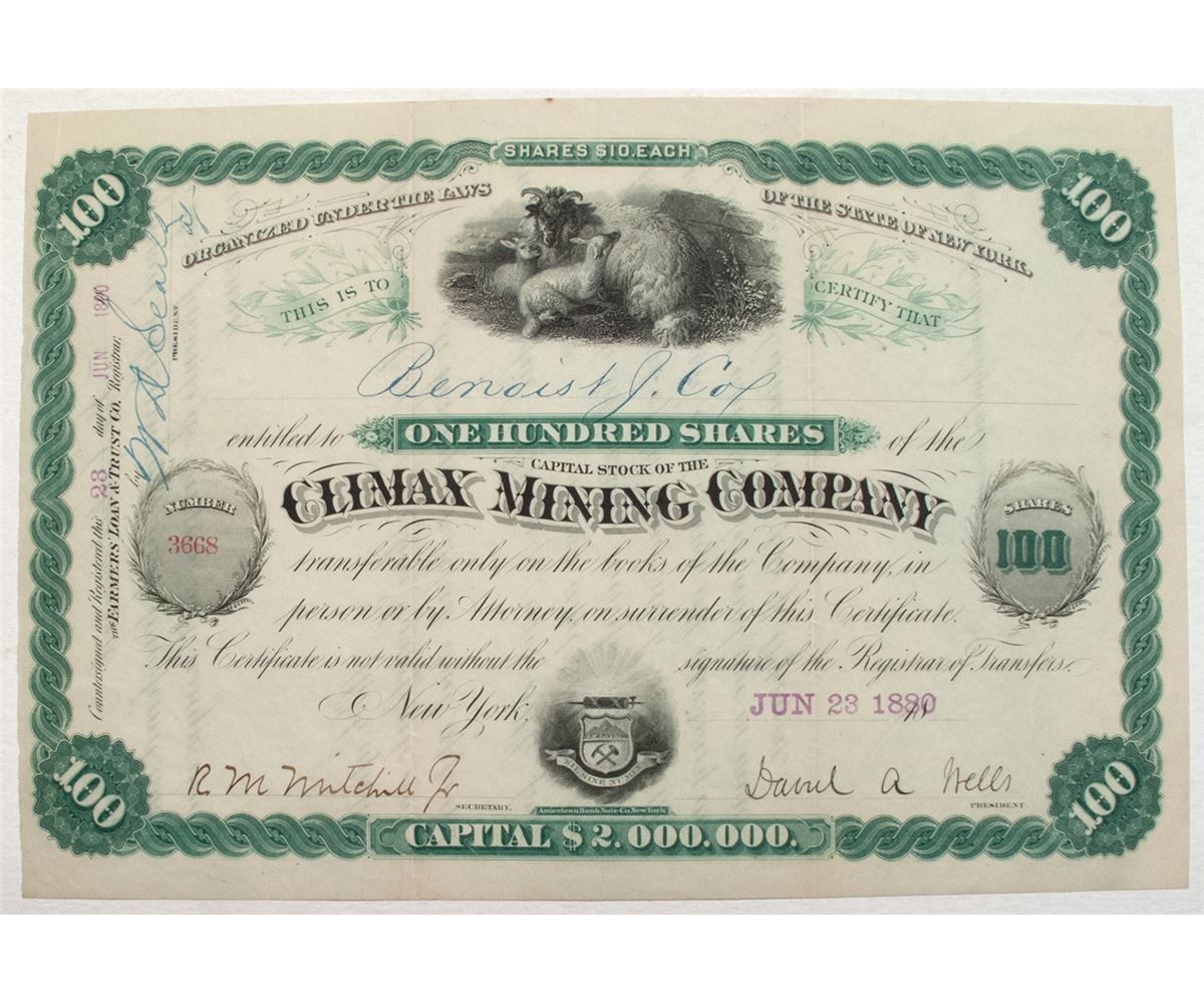 Incorporated in New York. Cert. # 3668 issued to Benoist J. Cox for 100 shares. Signed by Daniel A. Wells, president, and R.M. Mitchell, Jr., secretary. Two vignettes: large sheep with lamps at center and Colorado State seal at bottom. Green border on crème paper. U/C. Printer: ABNCo., New York. Datelined New York. Two fold creases. XF.